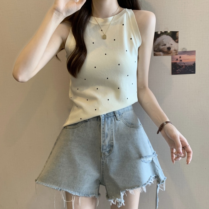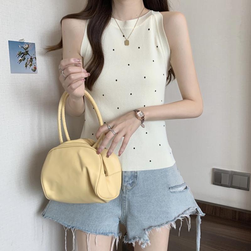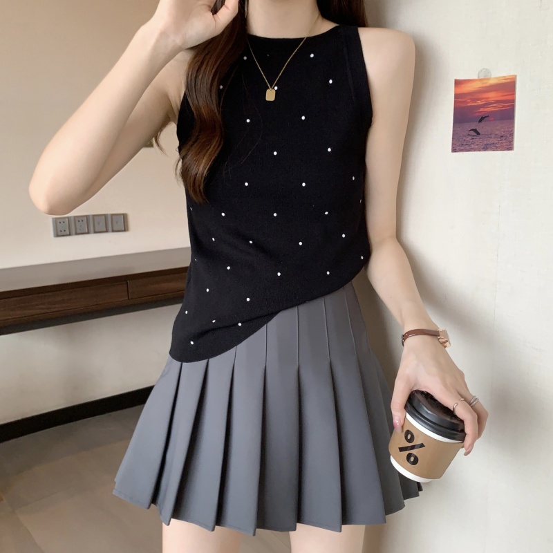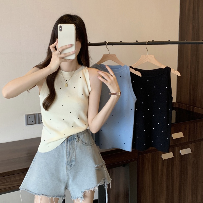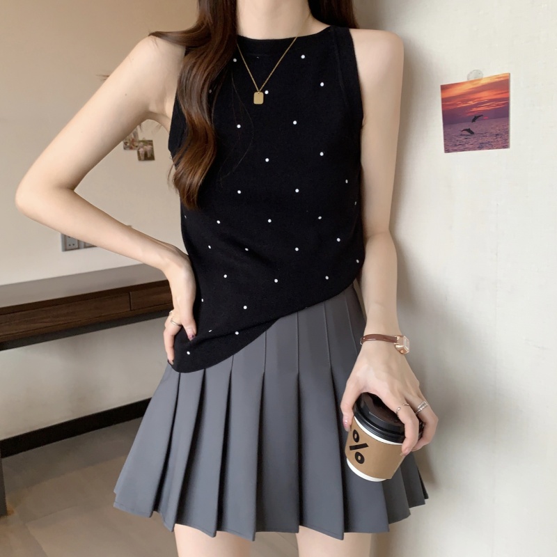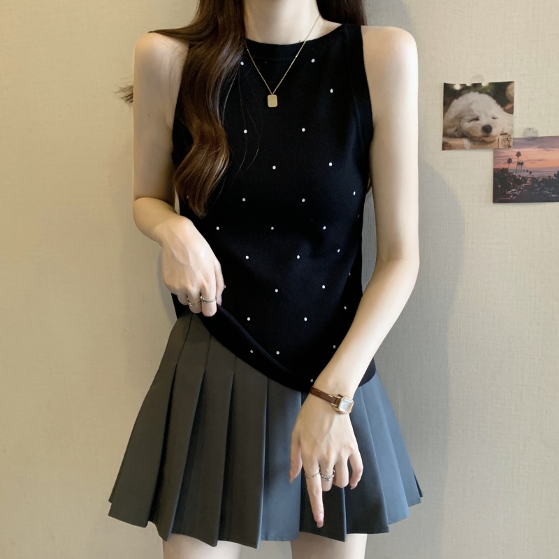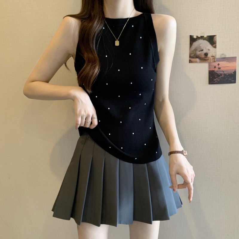 2024夏季复古风圆领套头无袖显瘦波点杏色休闲针织衫背心上衣女潮