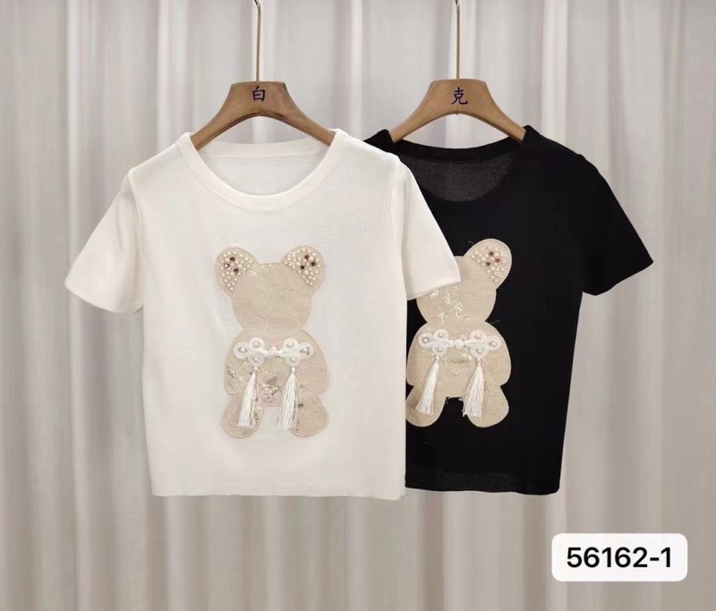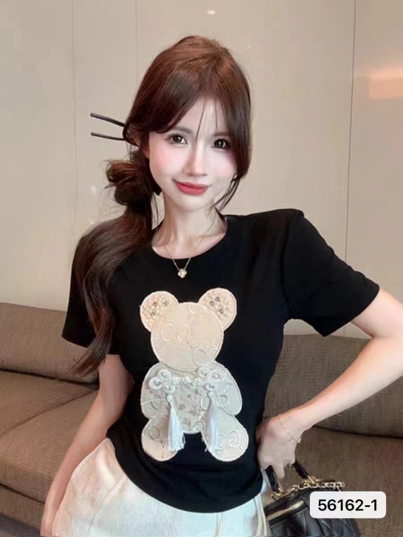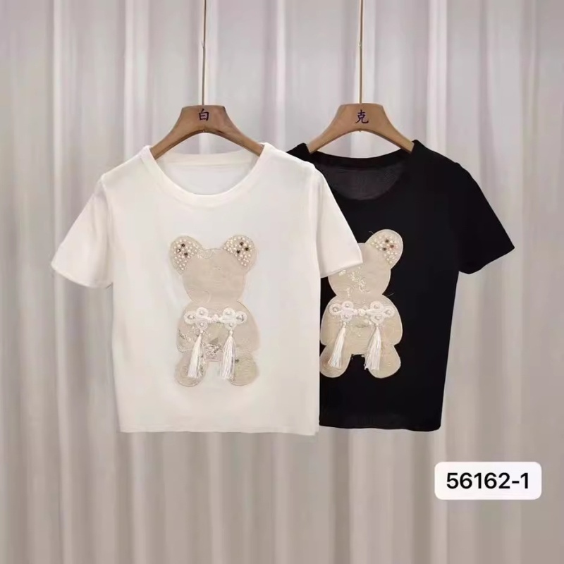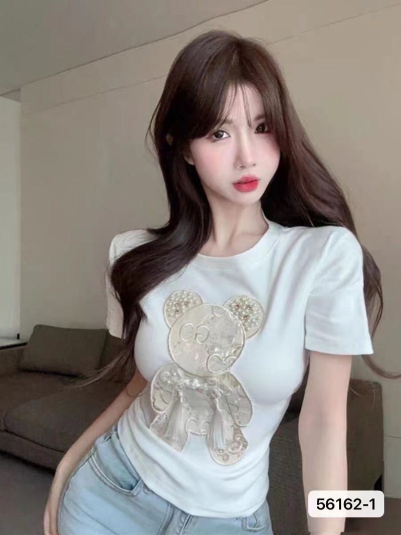 白色设计感重工钉珠小熊短袖女夏季新款小众修身显瘦打底百搭上衣