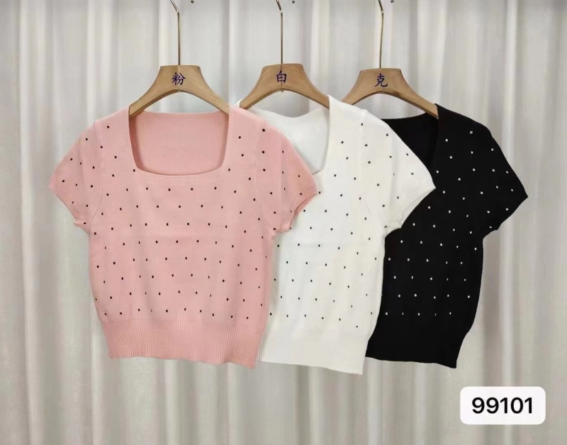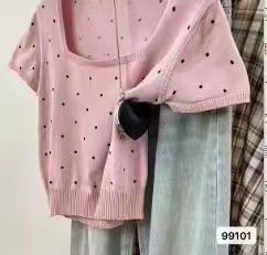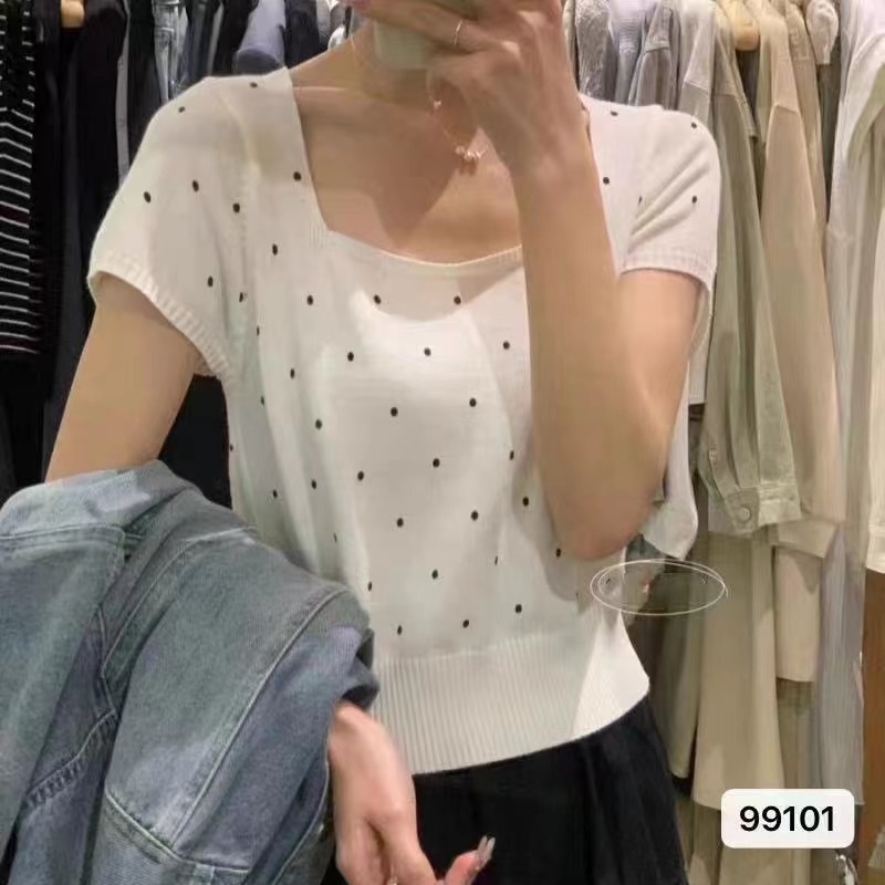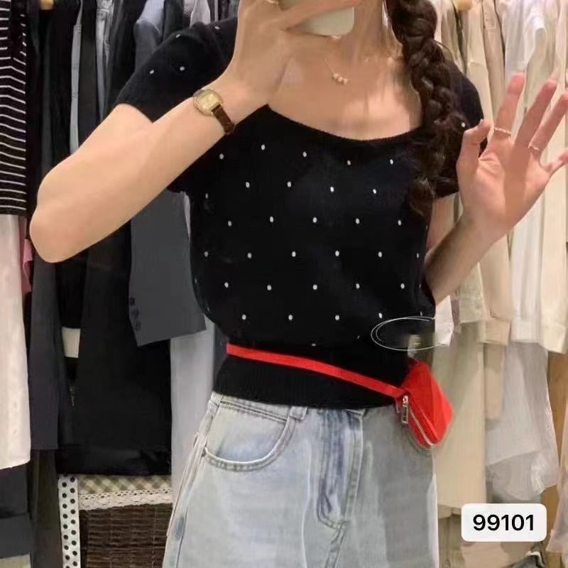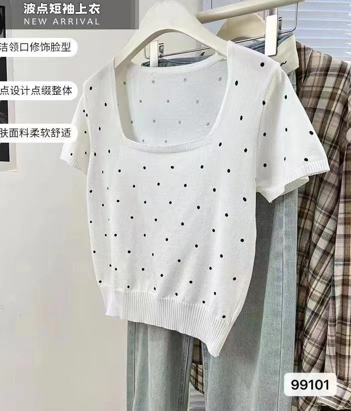 2024夏季新款甜美清新小众显瘦减龄方领波点印花百搭短袖上衣女潮