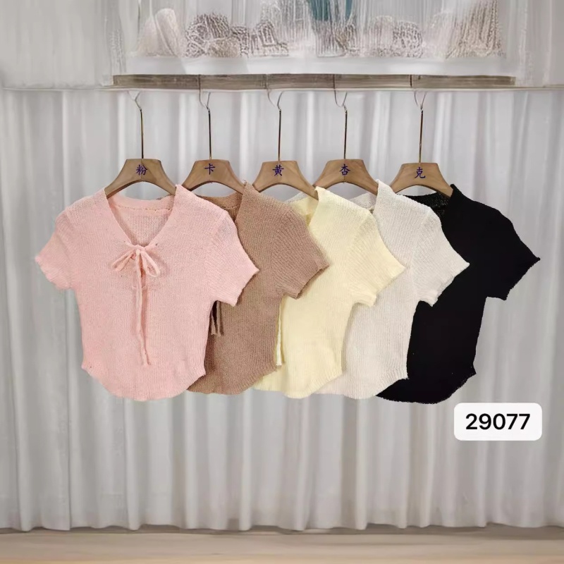 别致绝美针织衫夏季绑带短袖短款修身v领显瘦甜美套头短百搭上衣