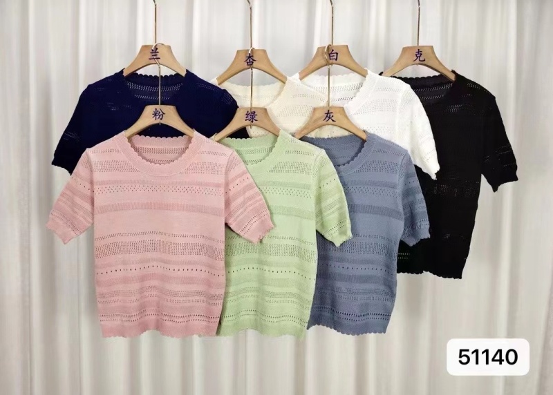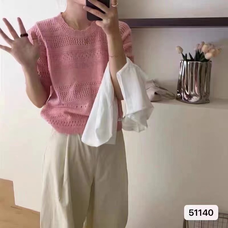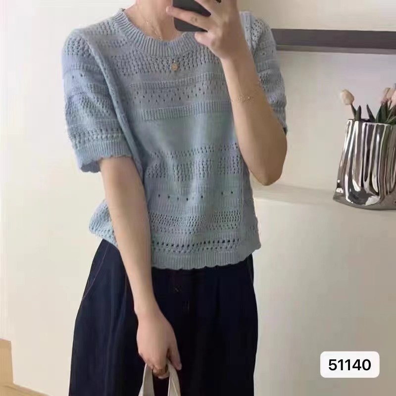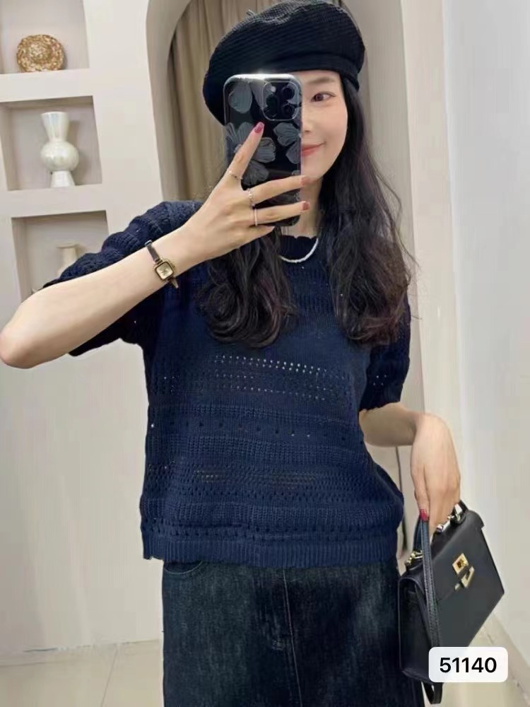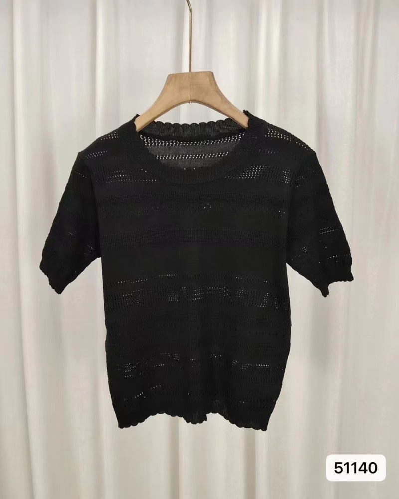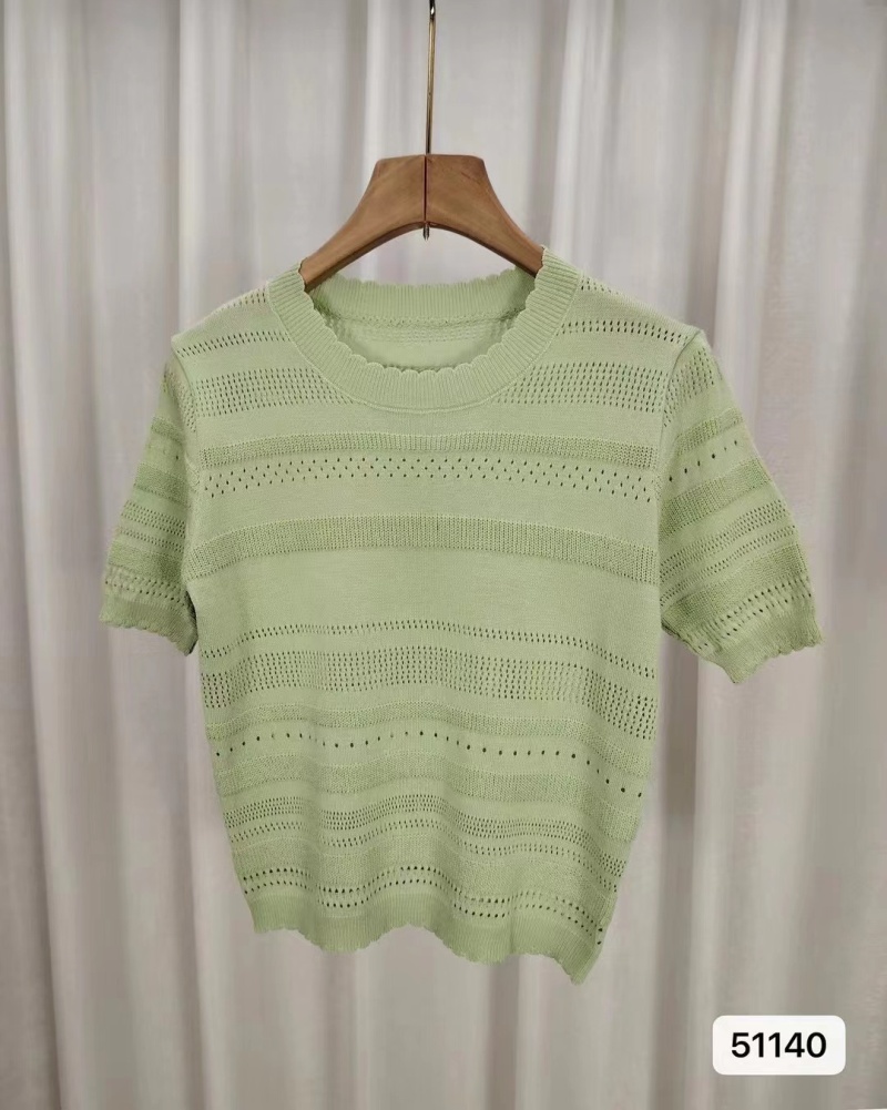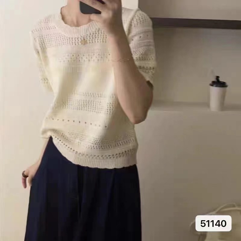 韩系小心机镂空短袖针织衫夏季甜美减龄显瘦套头打底衫百搭上衣女