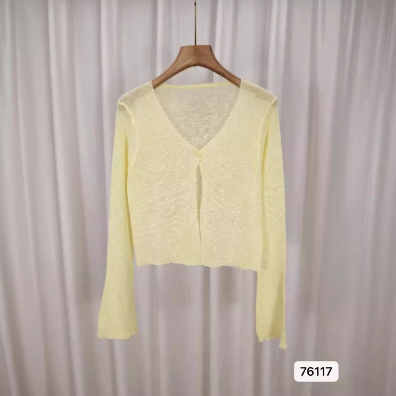 2024夏季新款百搭甜美清新显瘦韩系V领纯色微透喇叭袖短款防晒衣