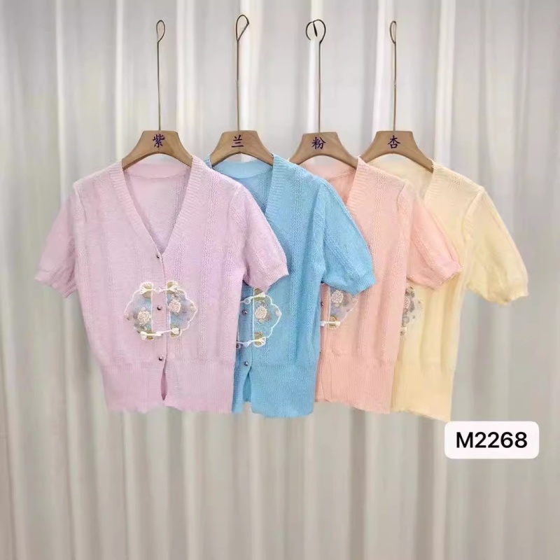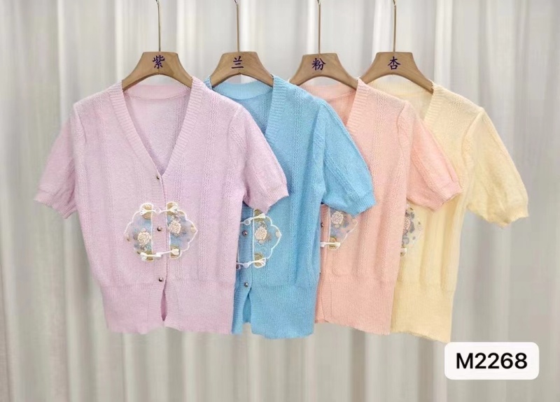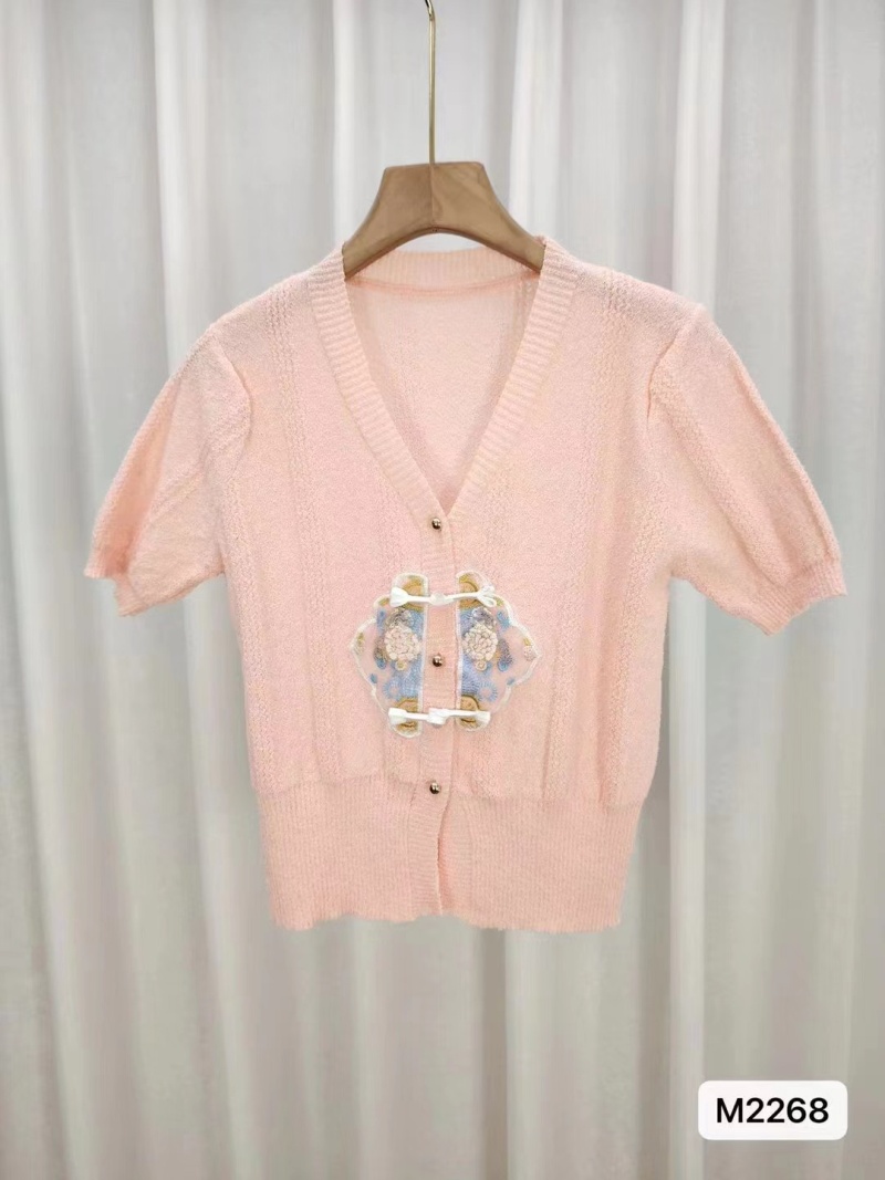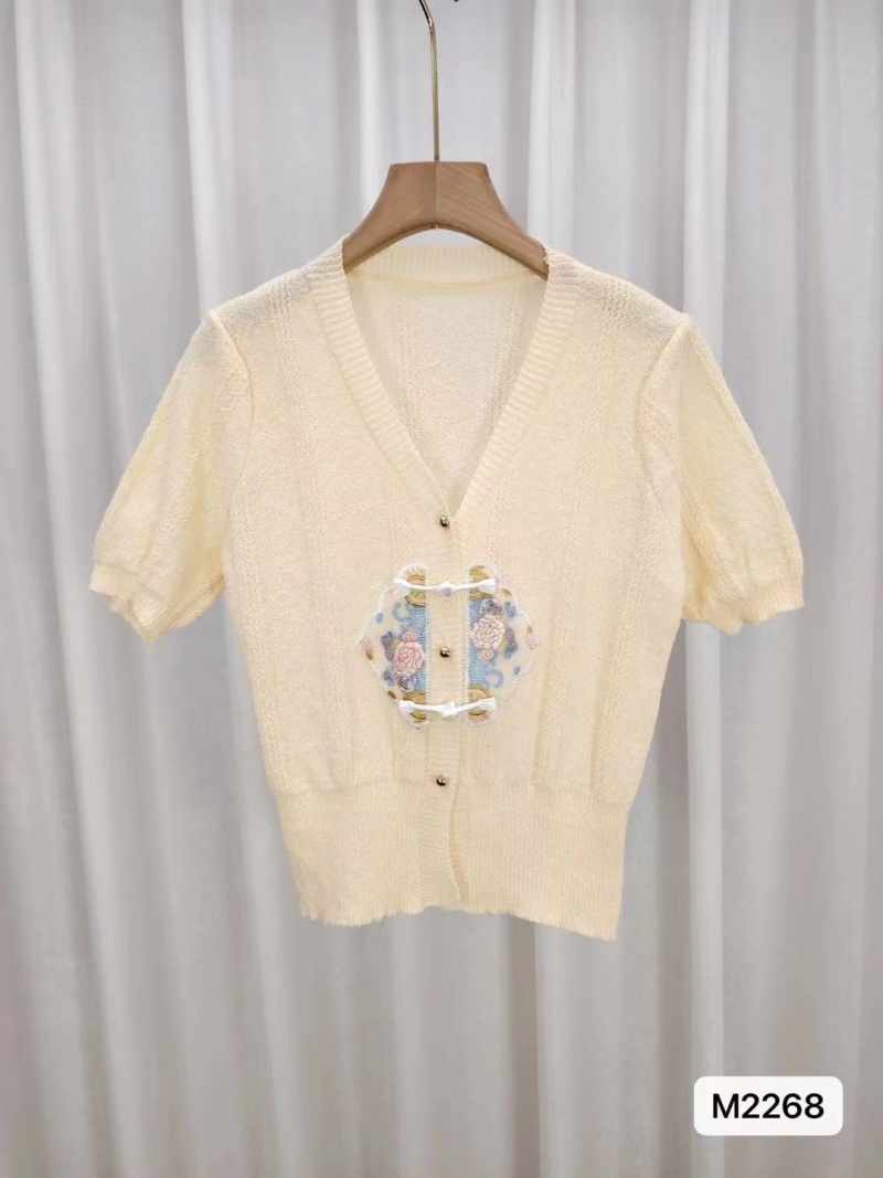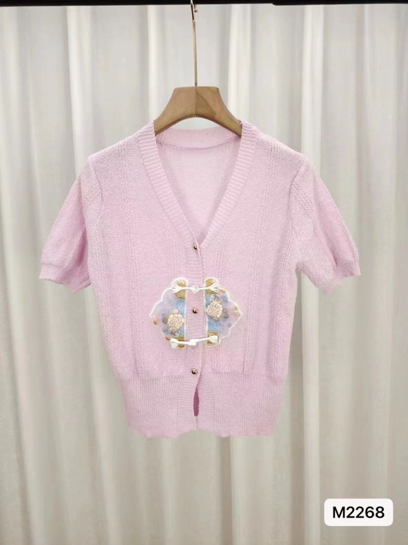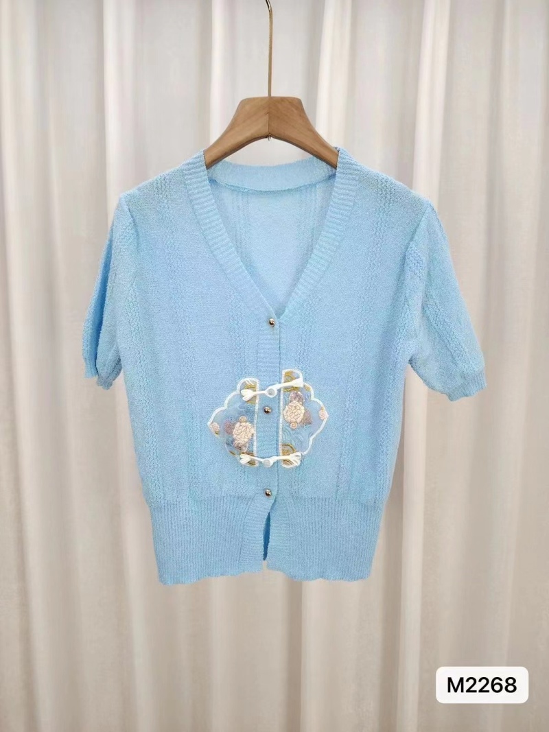 慵懒风短袖针织衫女2024年夏新款v领拼色刺绣甜美简约百搭上衣潮