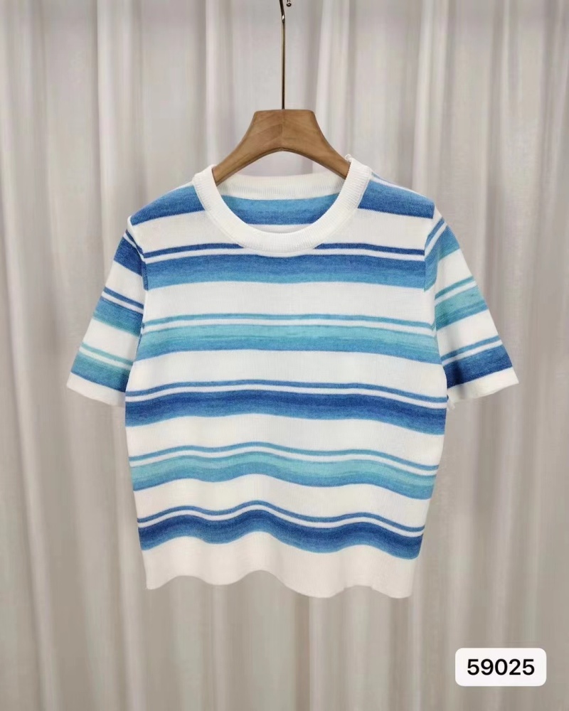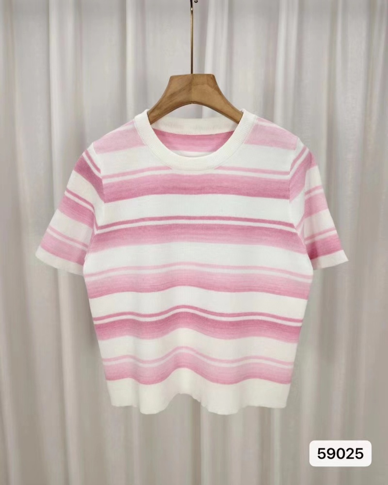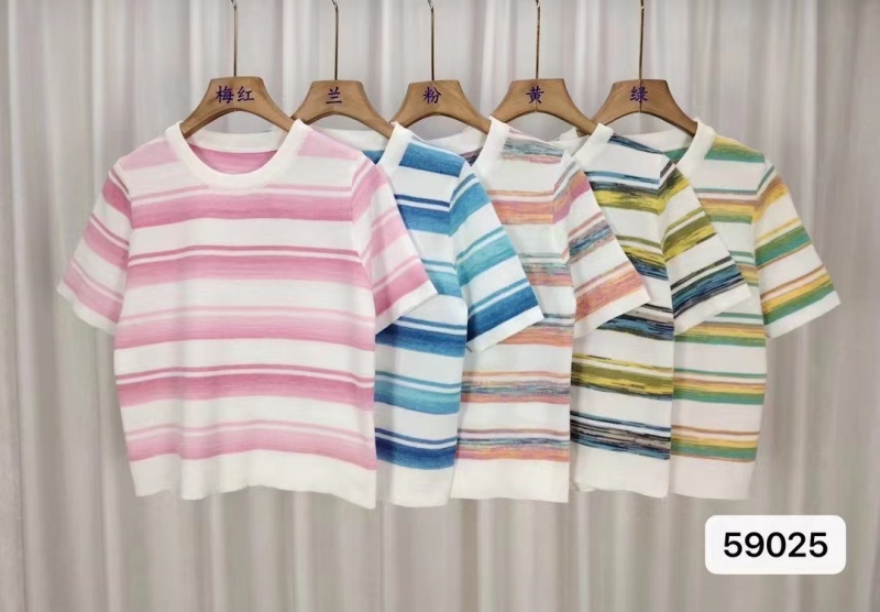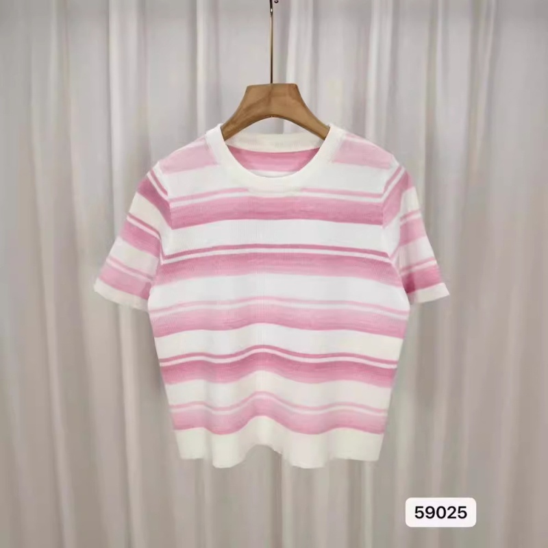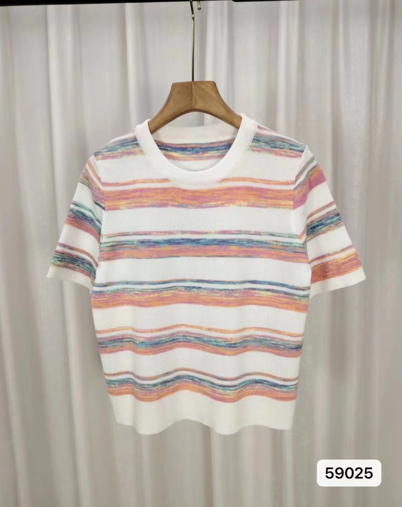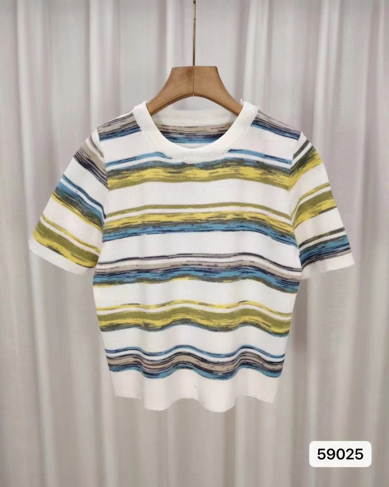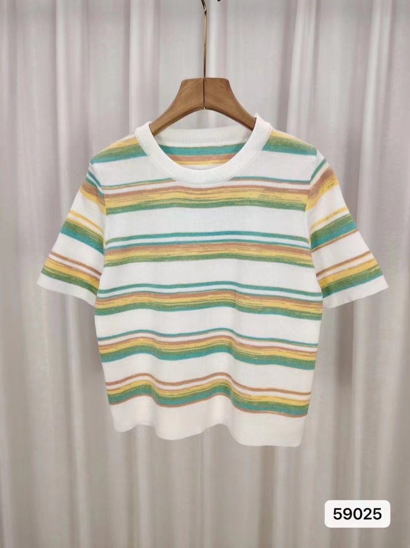 2024年夏季韩版新款时尚甜美百搭圆领彩色条纹百搭短袖百搭上衣女