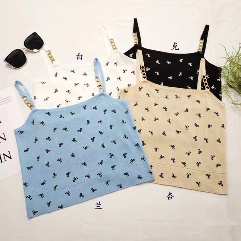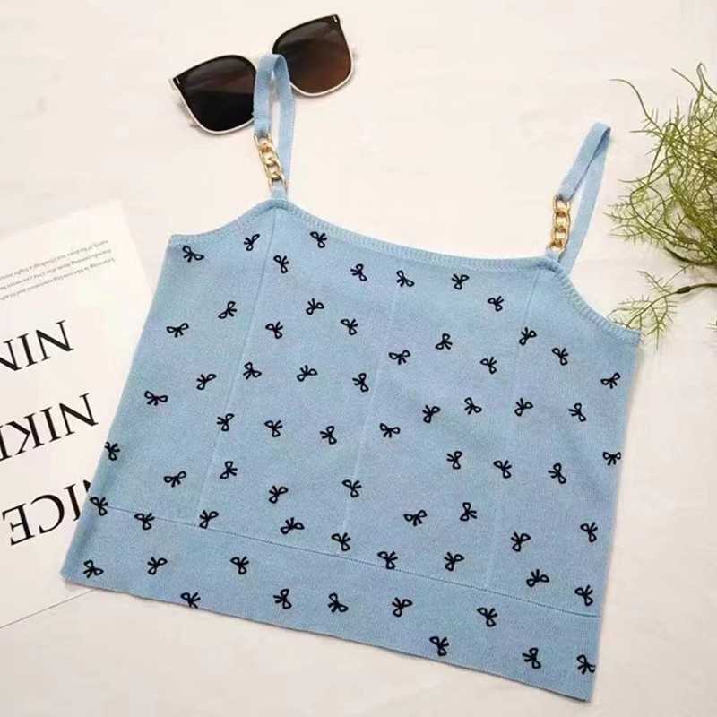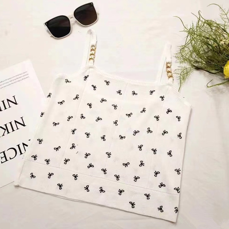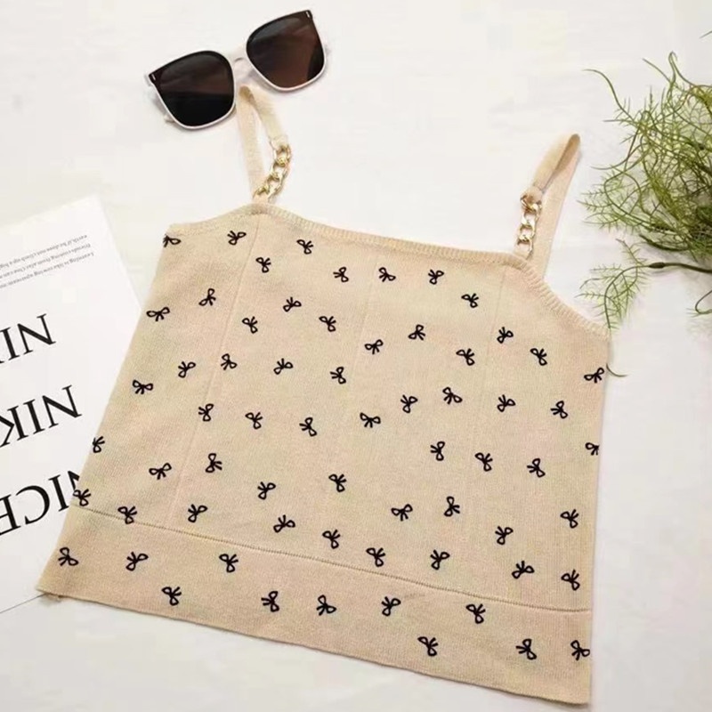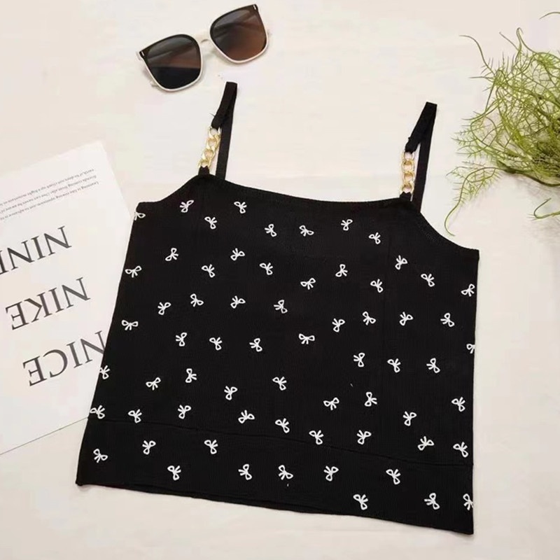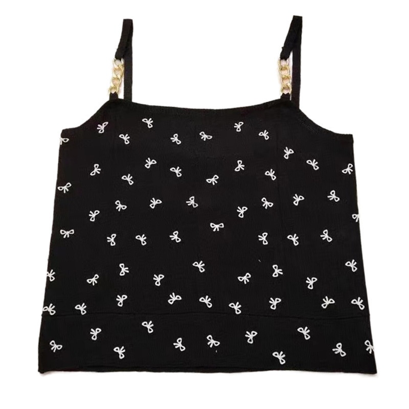 2024夏季新款时尚链条蝴蝶结印花百搭吊带薄款短款针织上衣