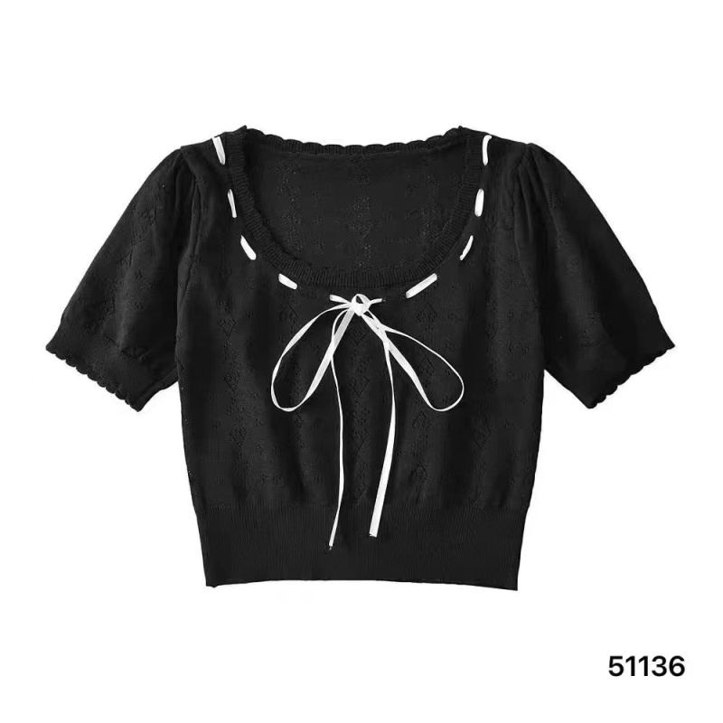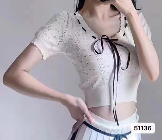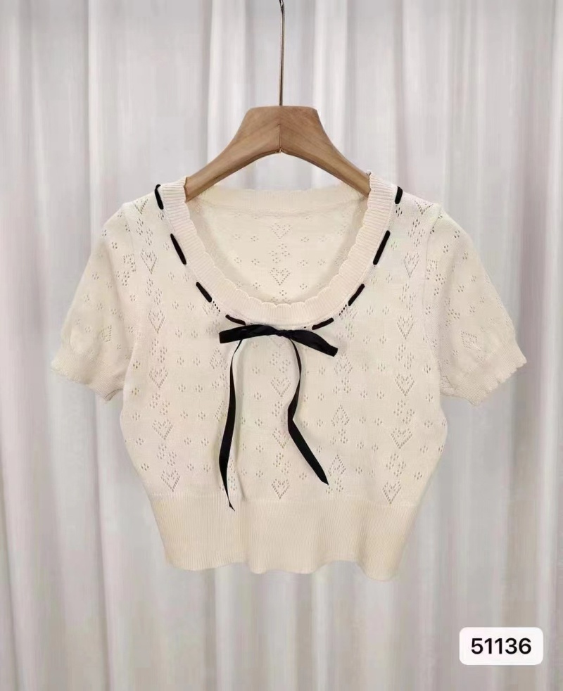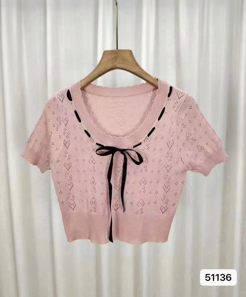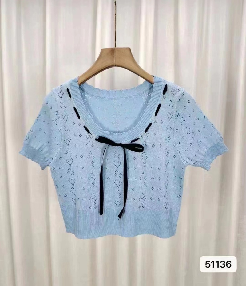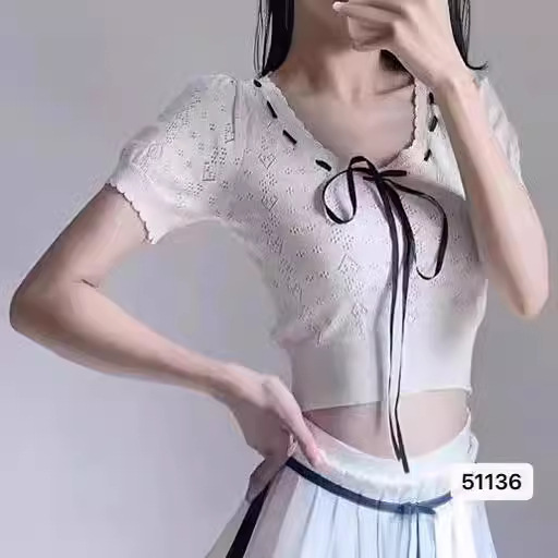 2024夏季新款法式少女穿孔丝带蝴蝶结镂空短袖上衣女