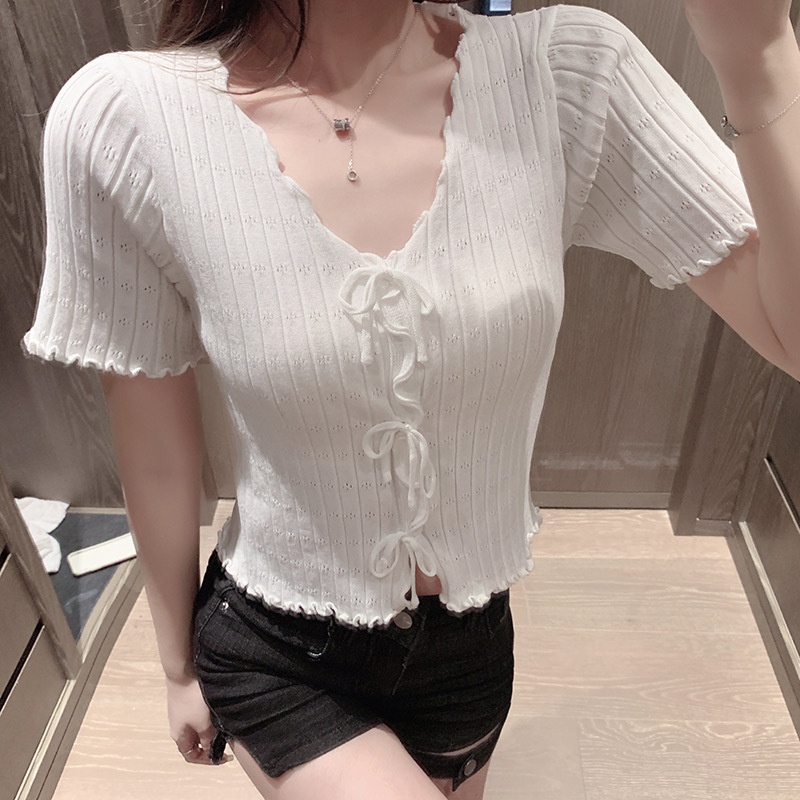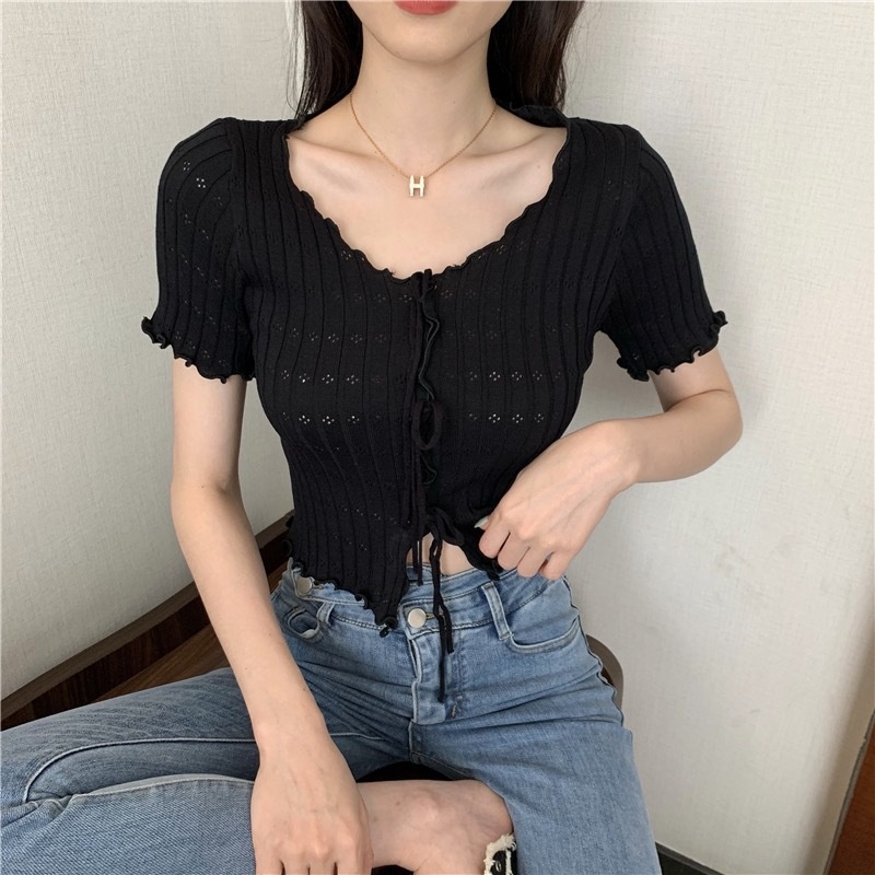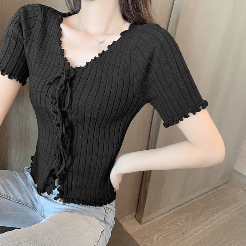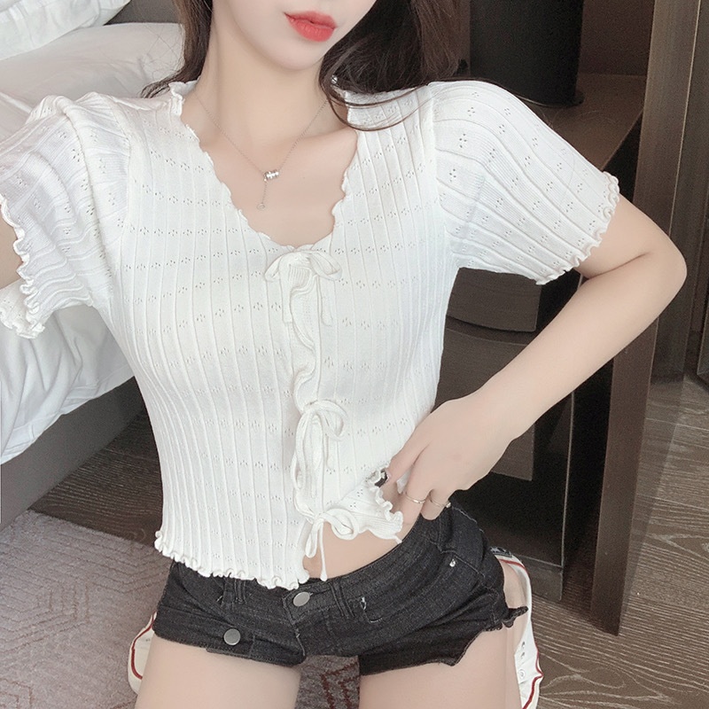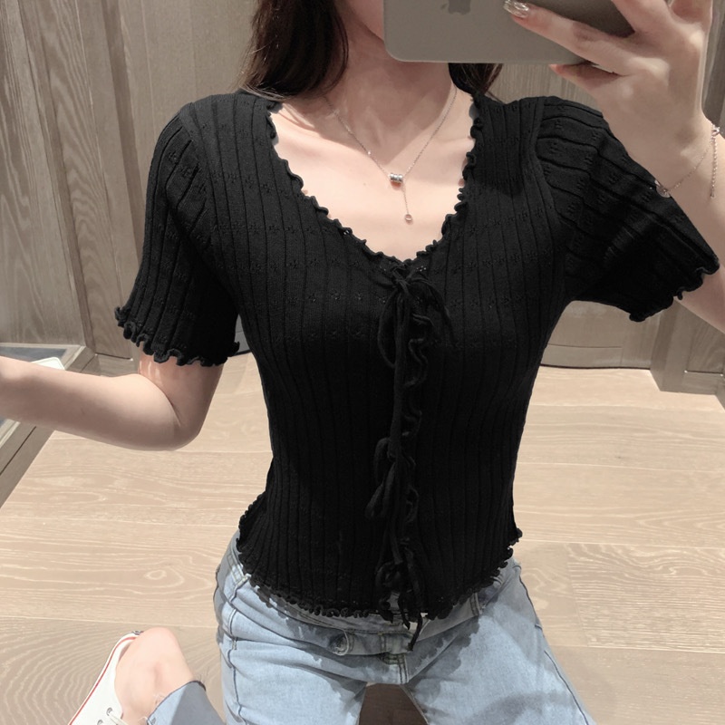 现货批发夏季冰丝修身木耳边针织甜美纯欲系带锁骨短袖短款上衣薄