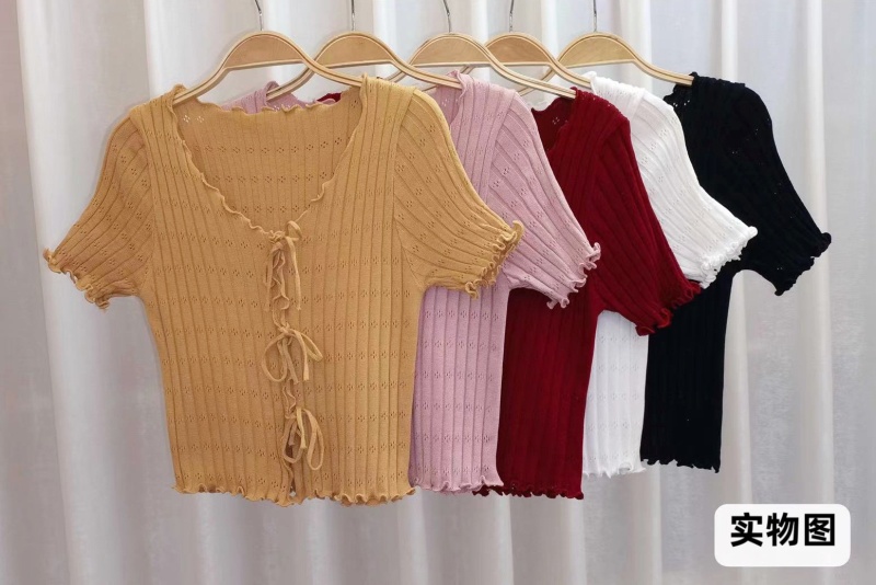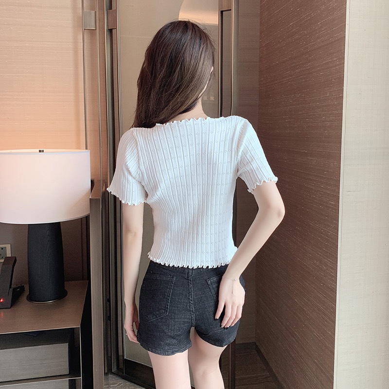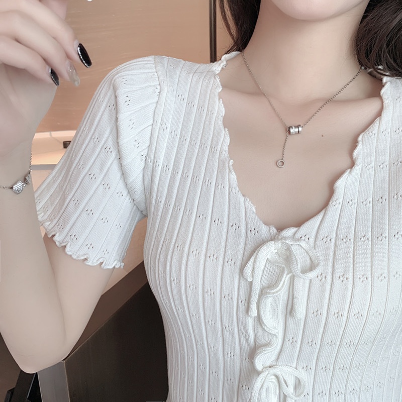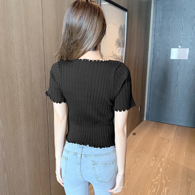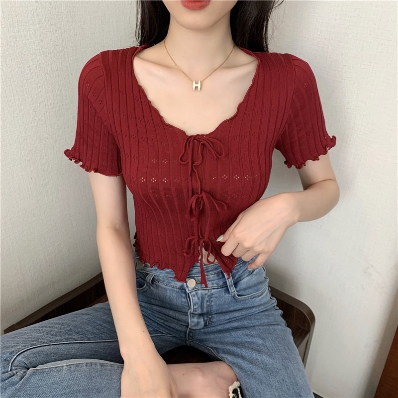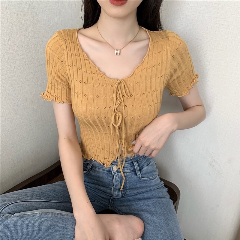 现货批发夏季冰丝修身木耳边针织甜美纯欲系带锁骨短袖短款上衣薄