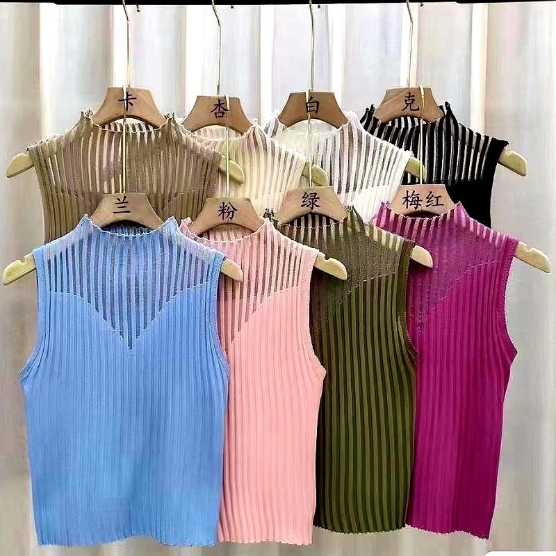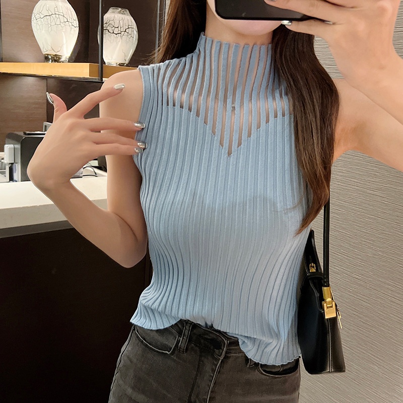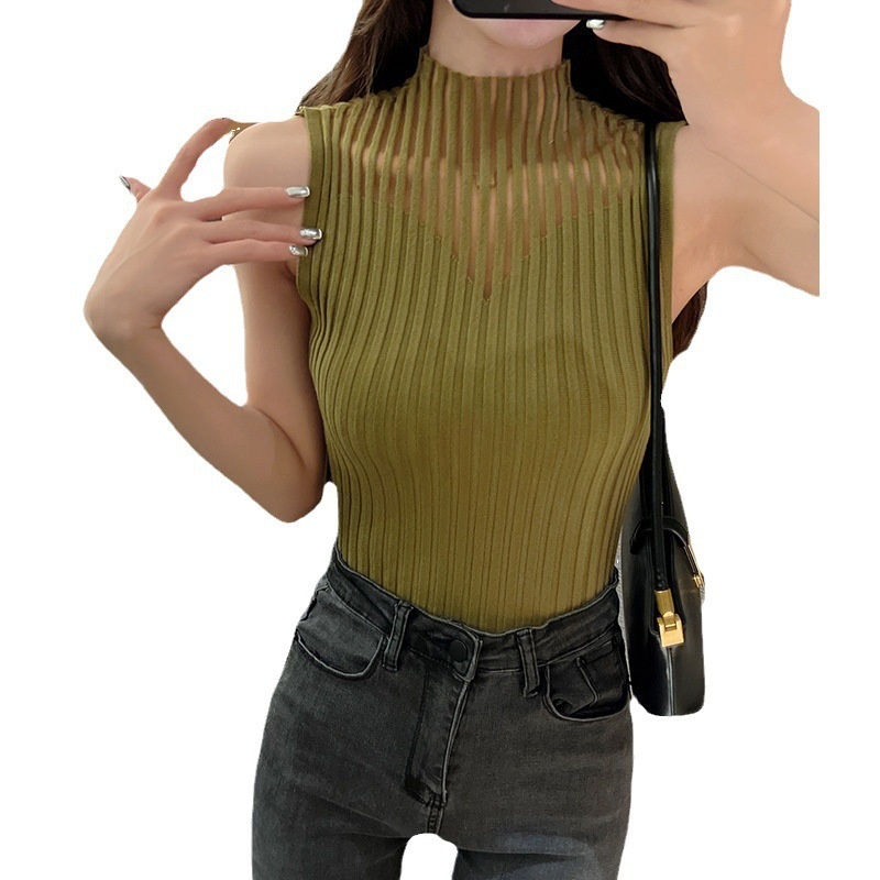 2023新款早秋半高领镂空针织毛衣网纱背心拼接内搭紧身无袖上衣女