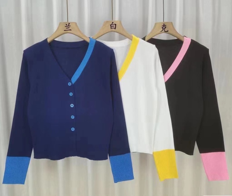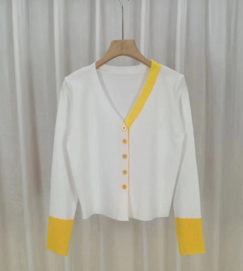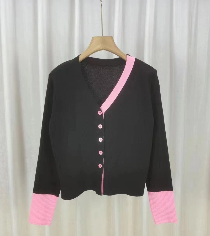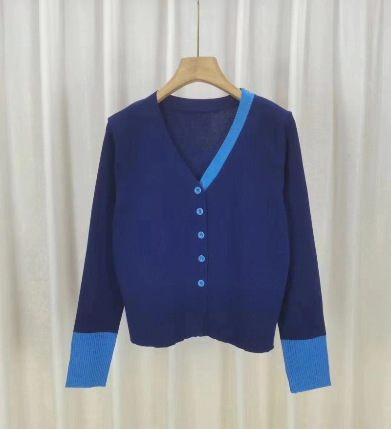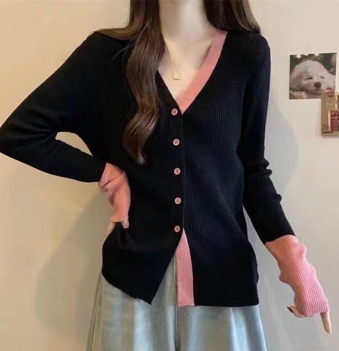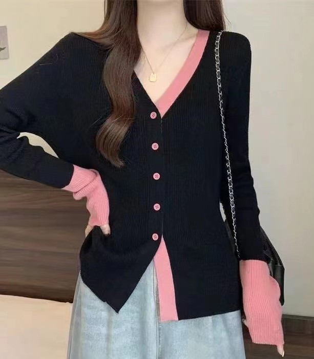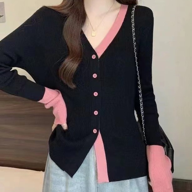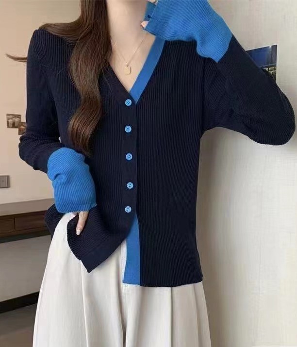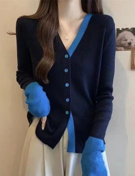 2023秋冬新款轻熟风气质针织开衫韩版V领针织拼色排扣显瘦上衣女