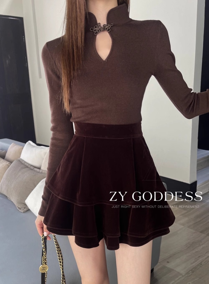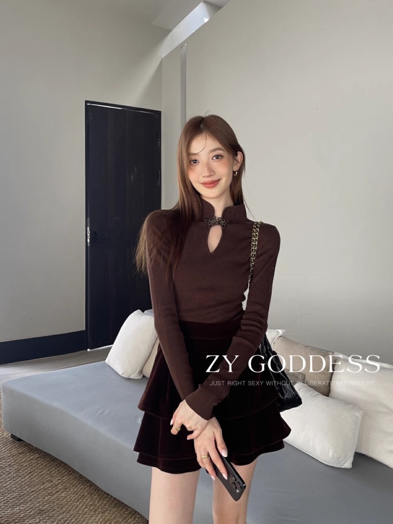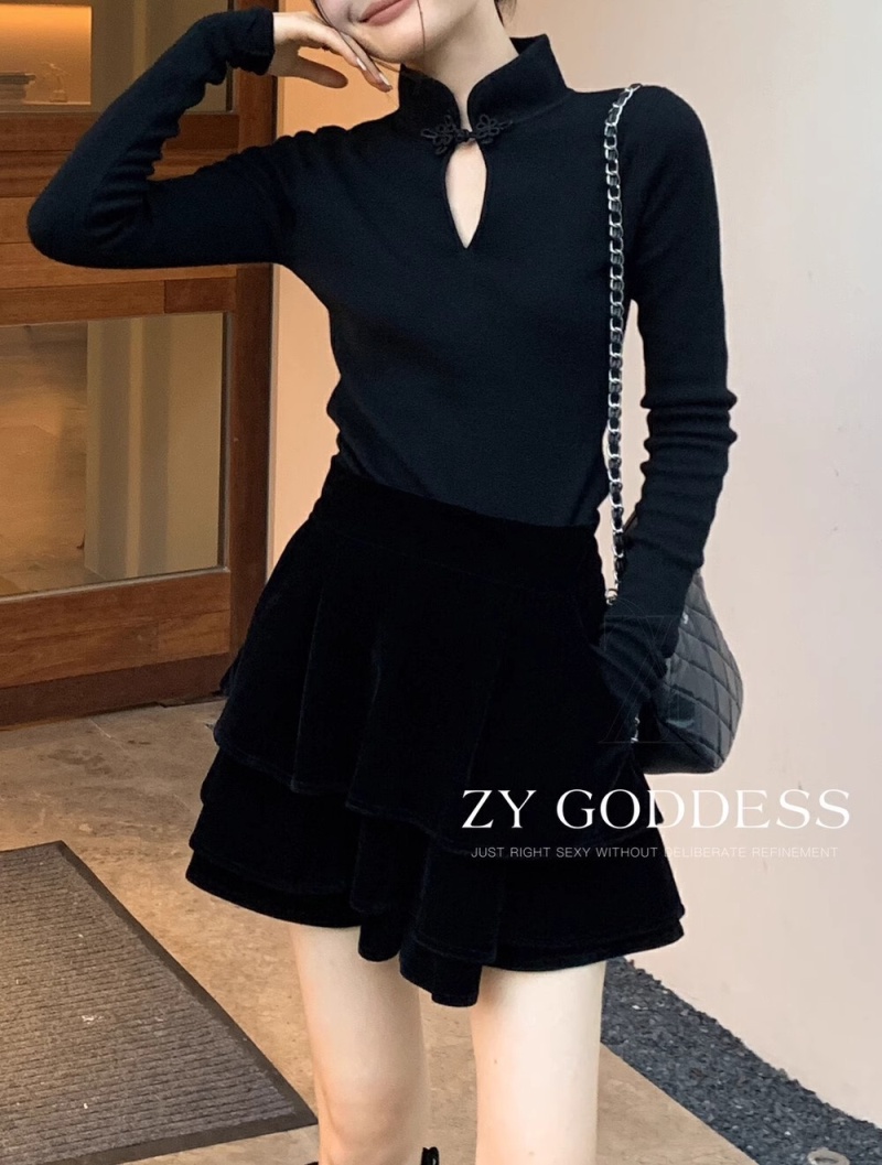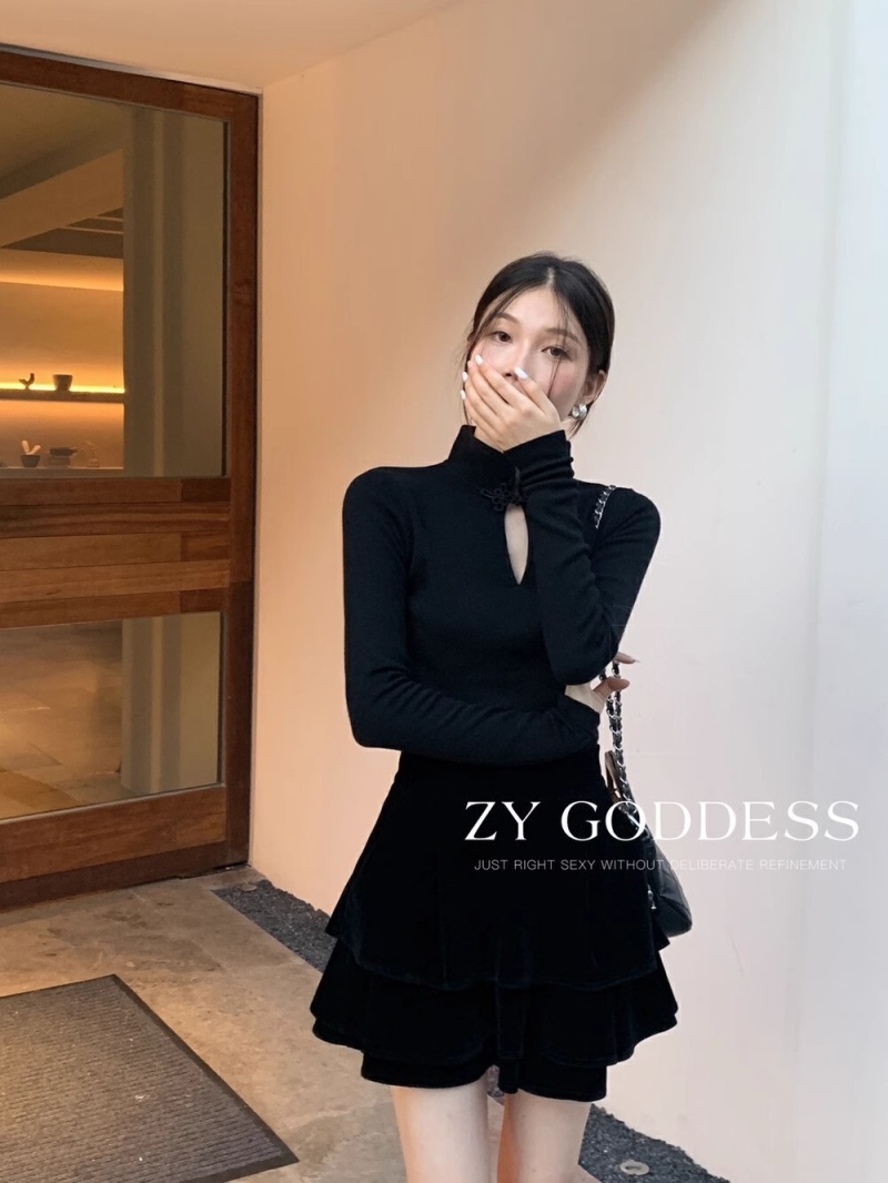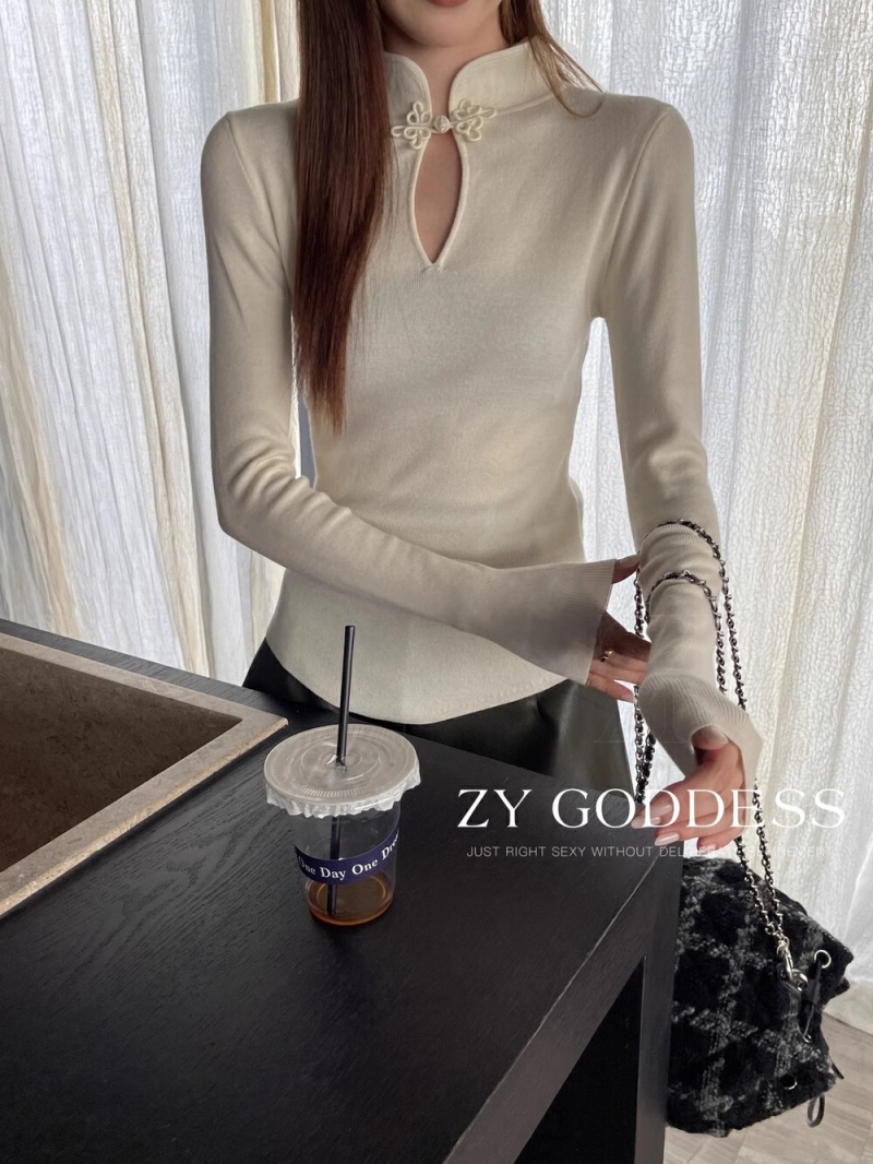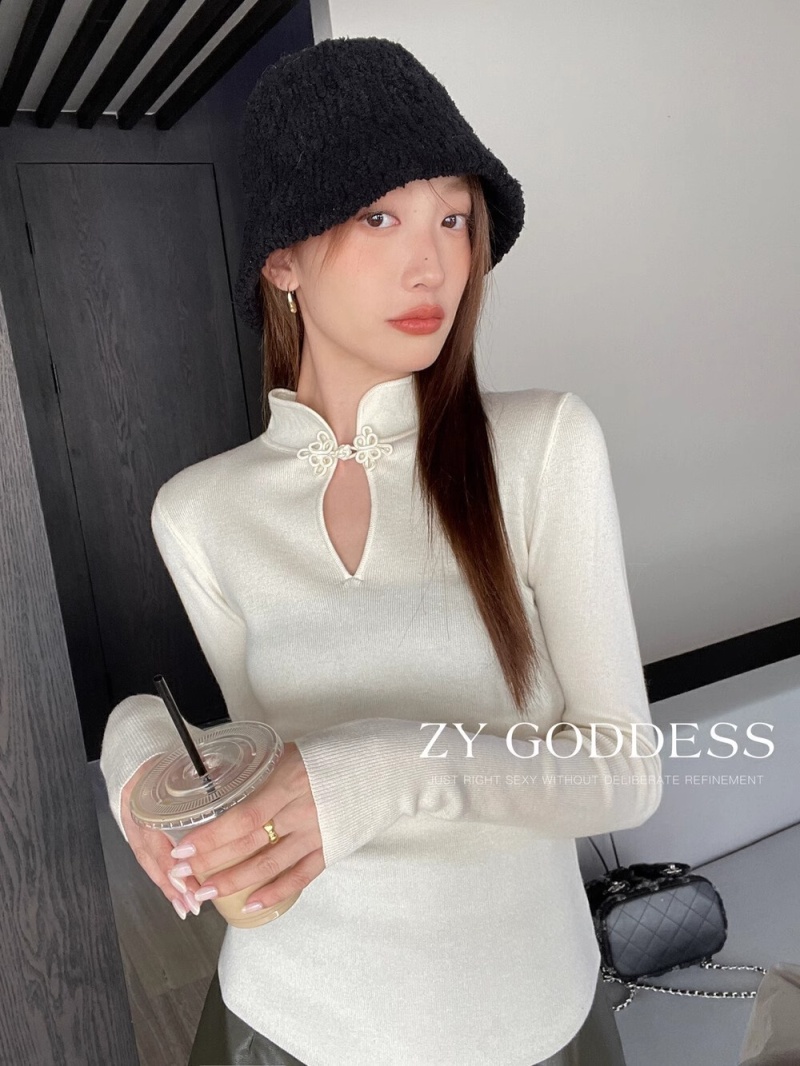 2023秋冬季新款新中式修身打底针织衫女国风镂空短款毛衣上衣女