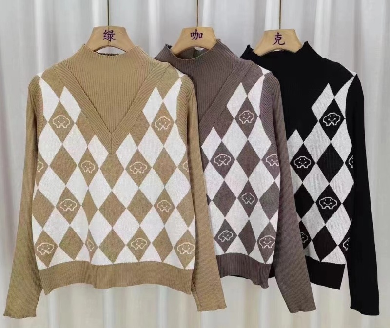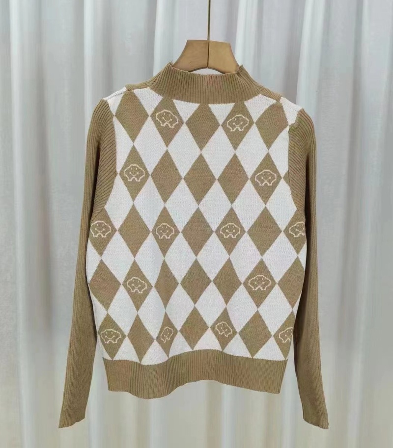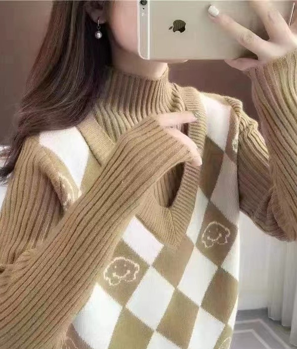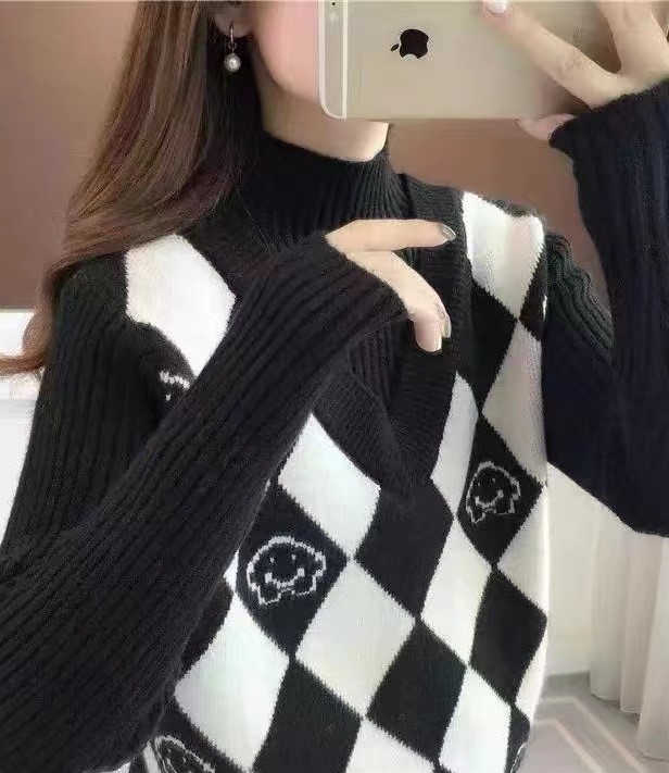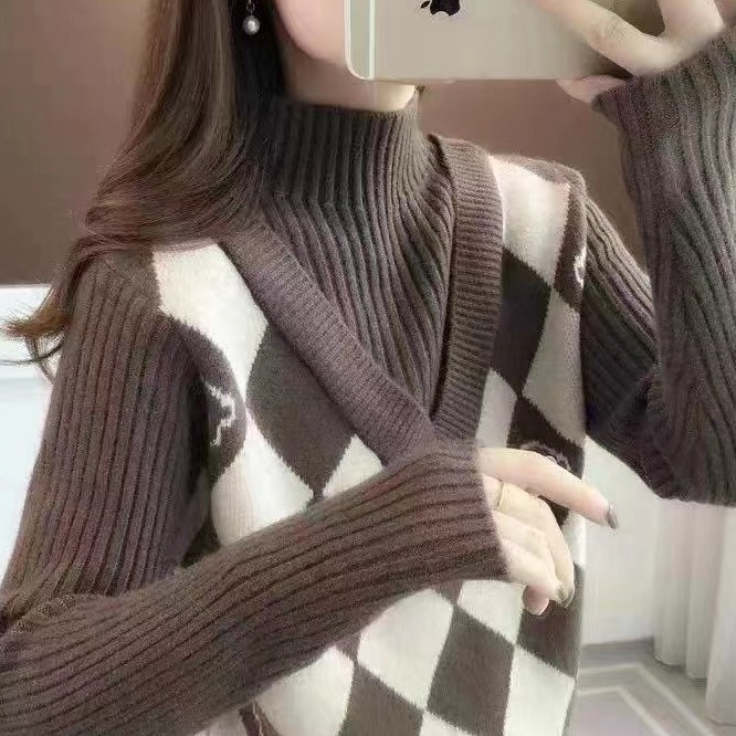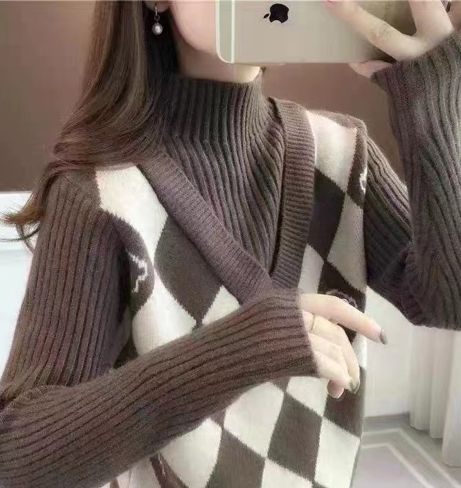 2023秋季新款半高领假两件针织衫设计感洋气拼接撞色菱格上衣女