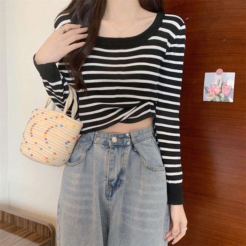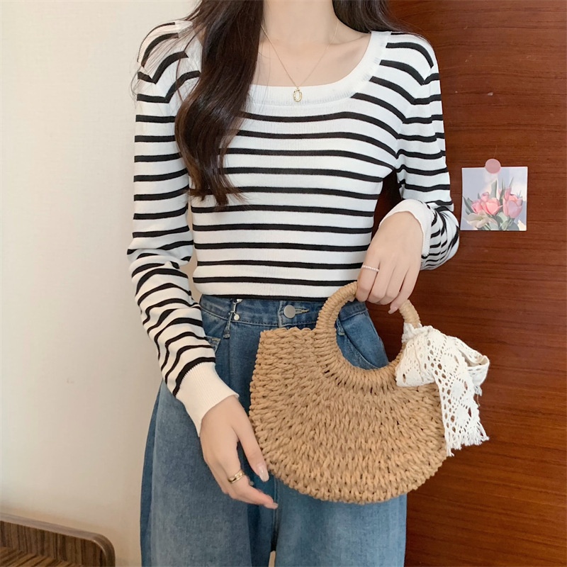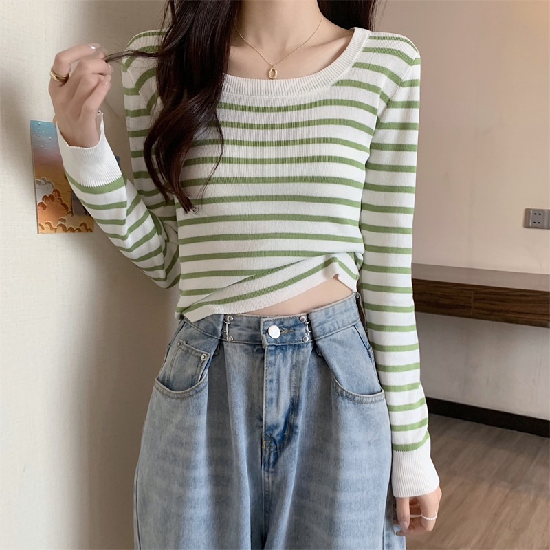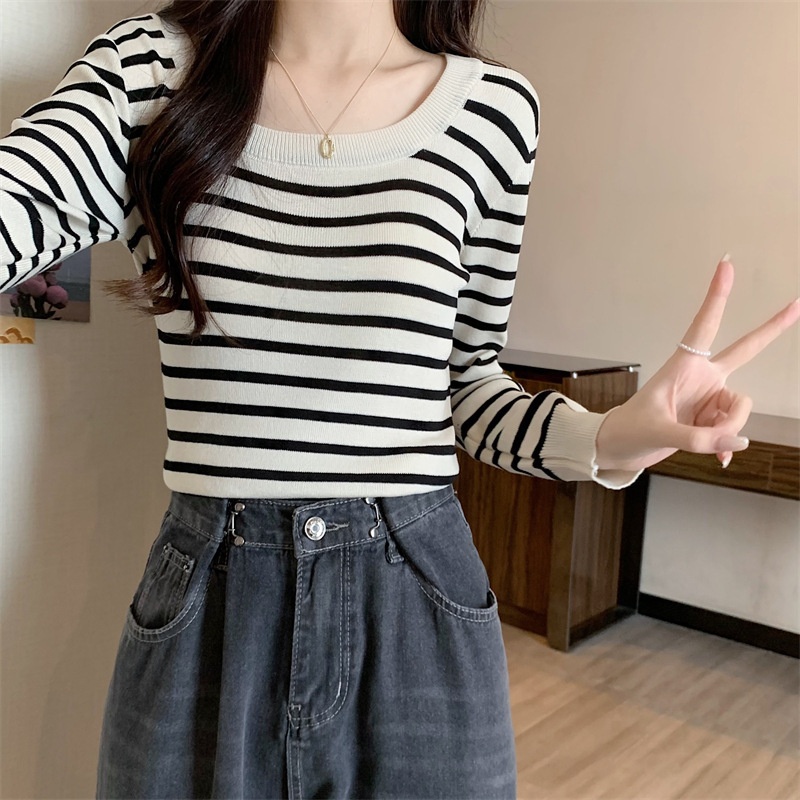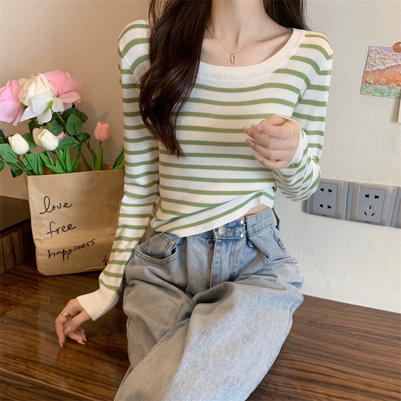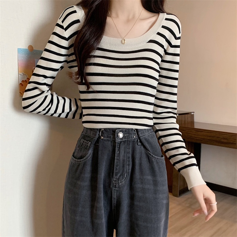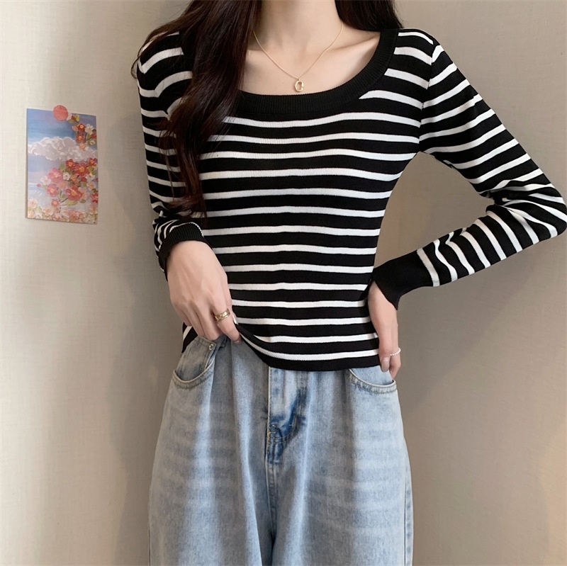 2023秋冬新款气质百搭针织衫修身显瘦方领条纹打底长袖短款上衣女