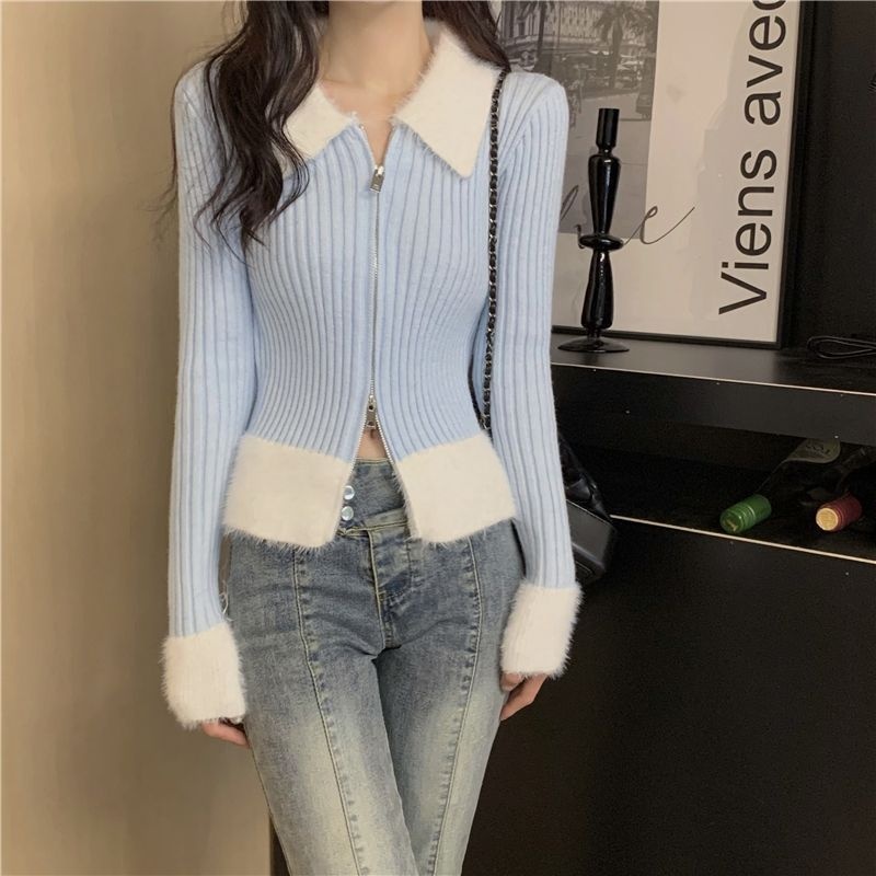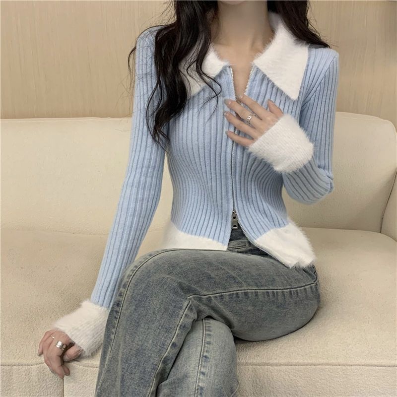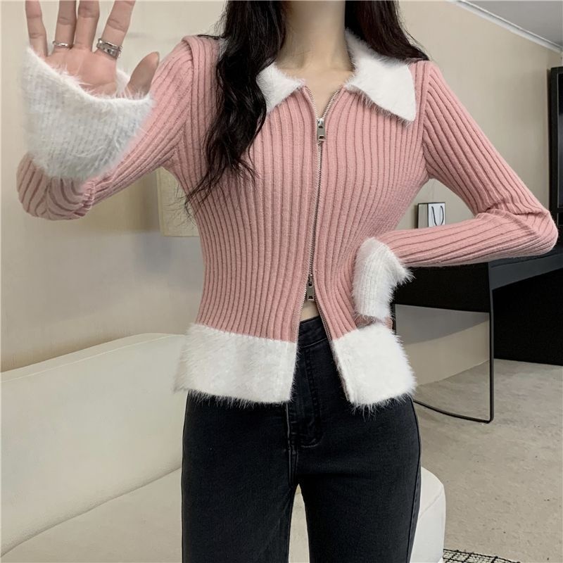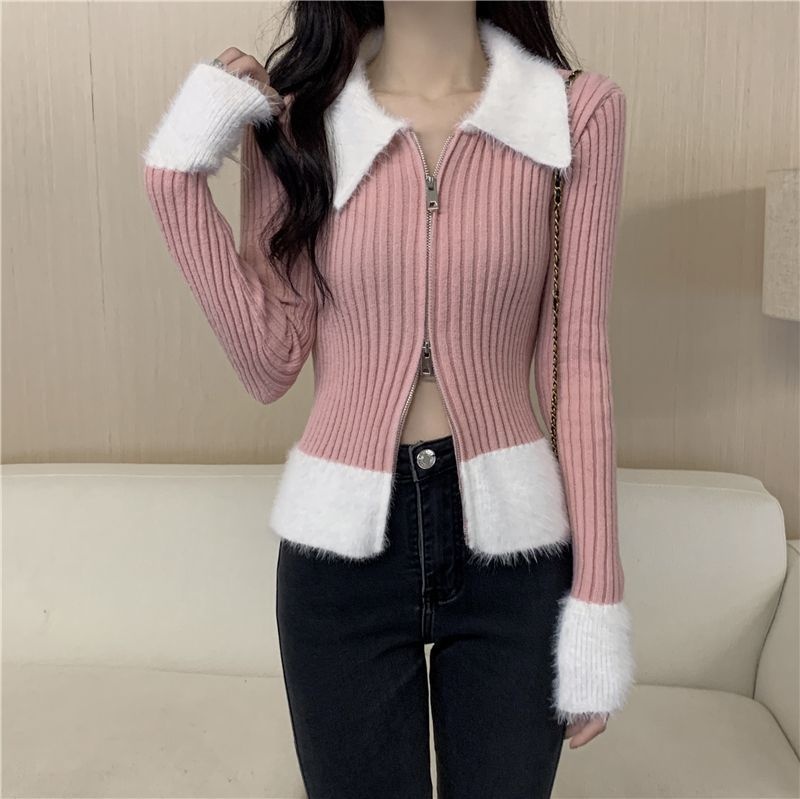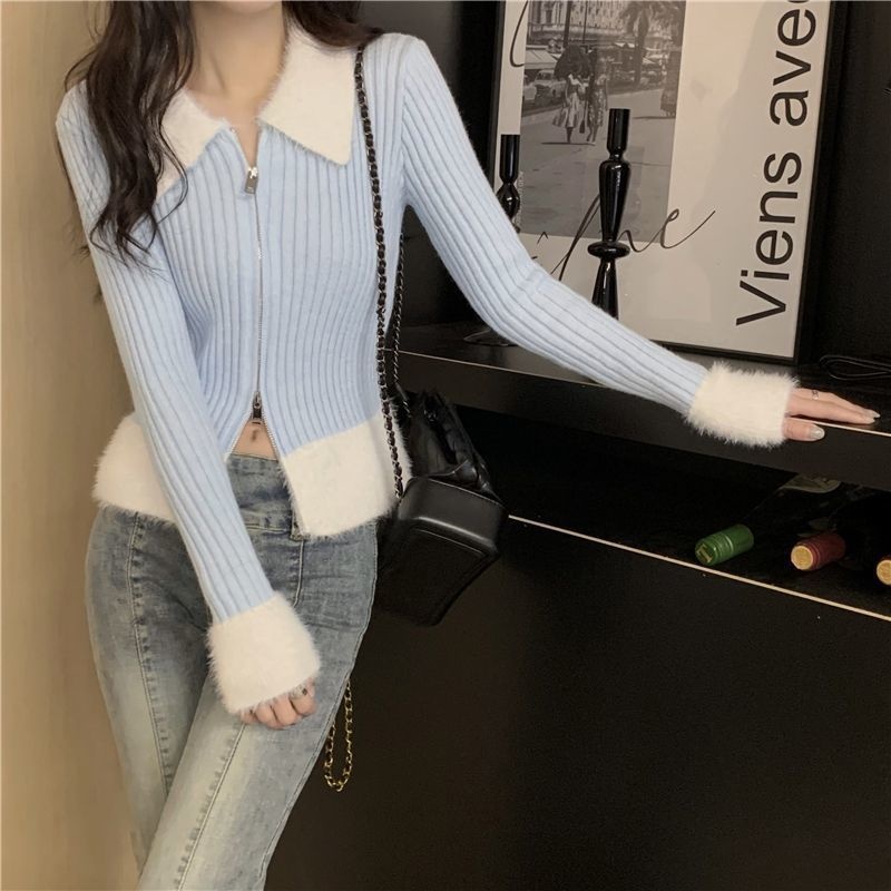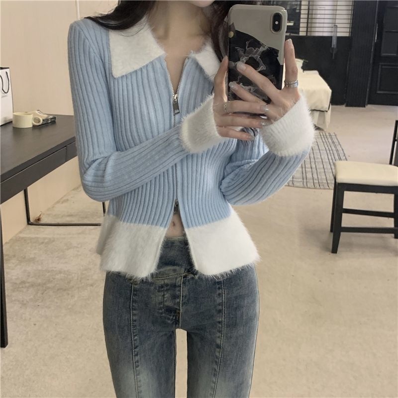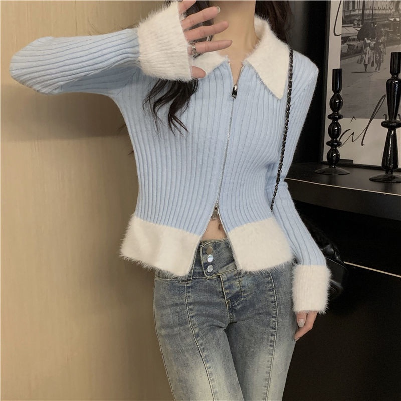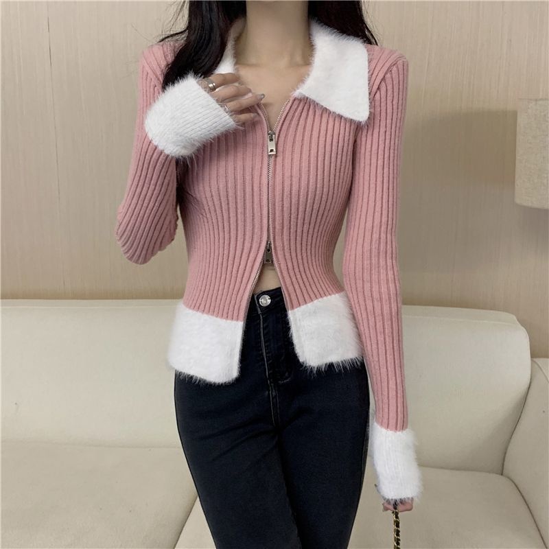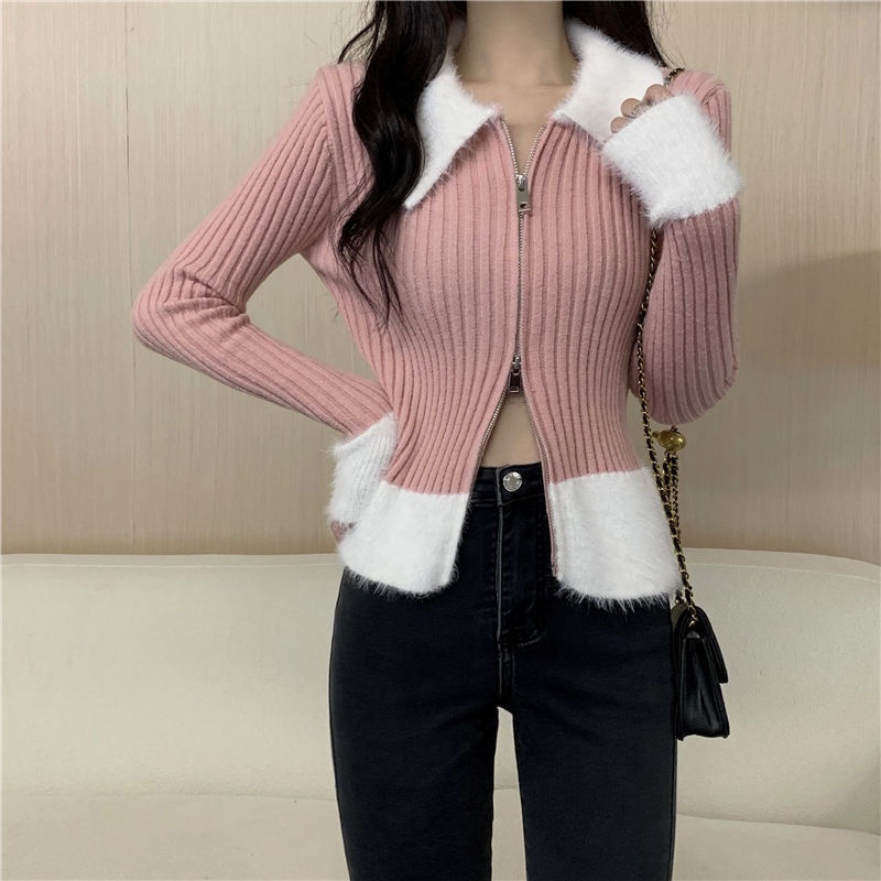 秋冬别致拼接港味毛衣氛围感红色针织开衫女短款修身洋气圣诞上衣