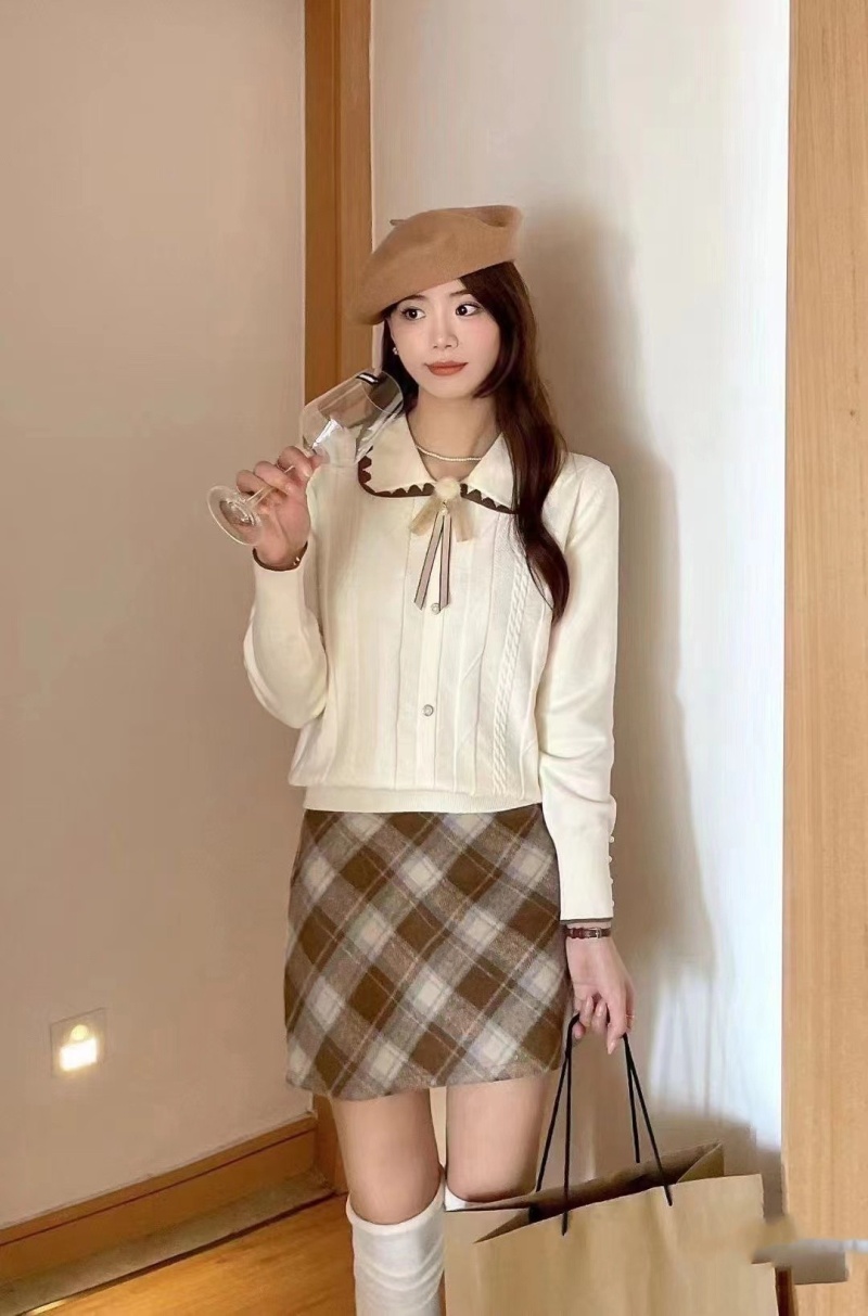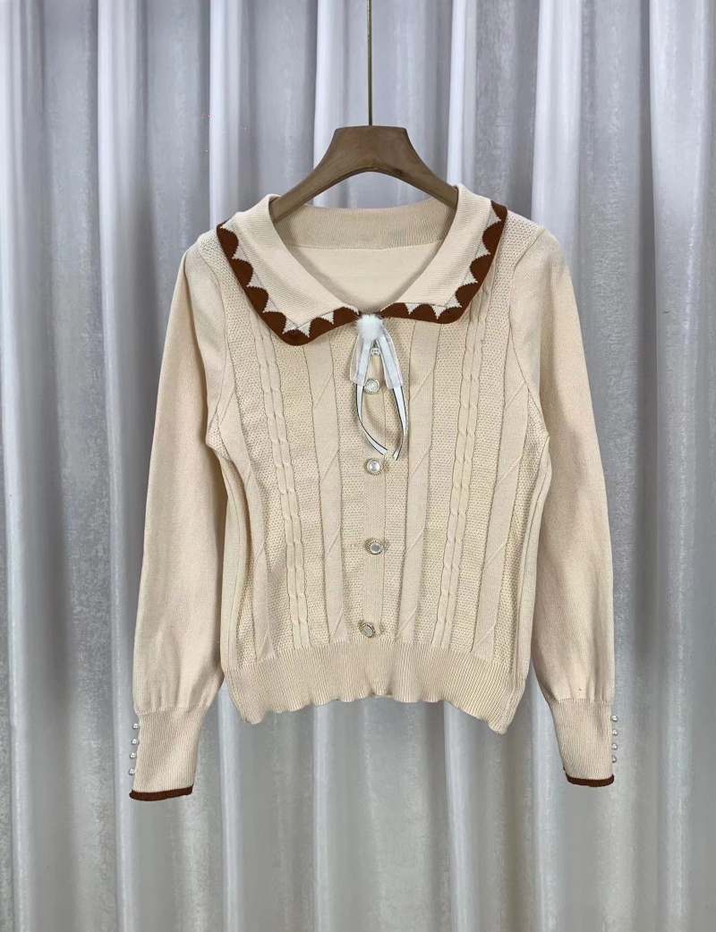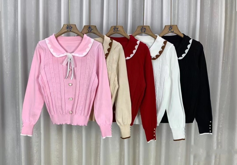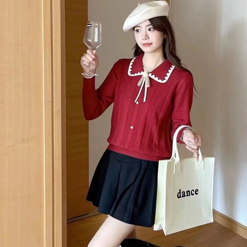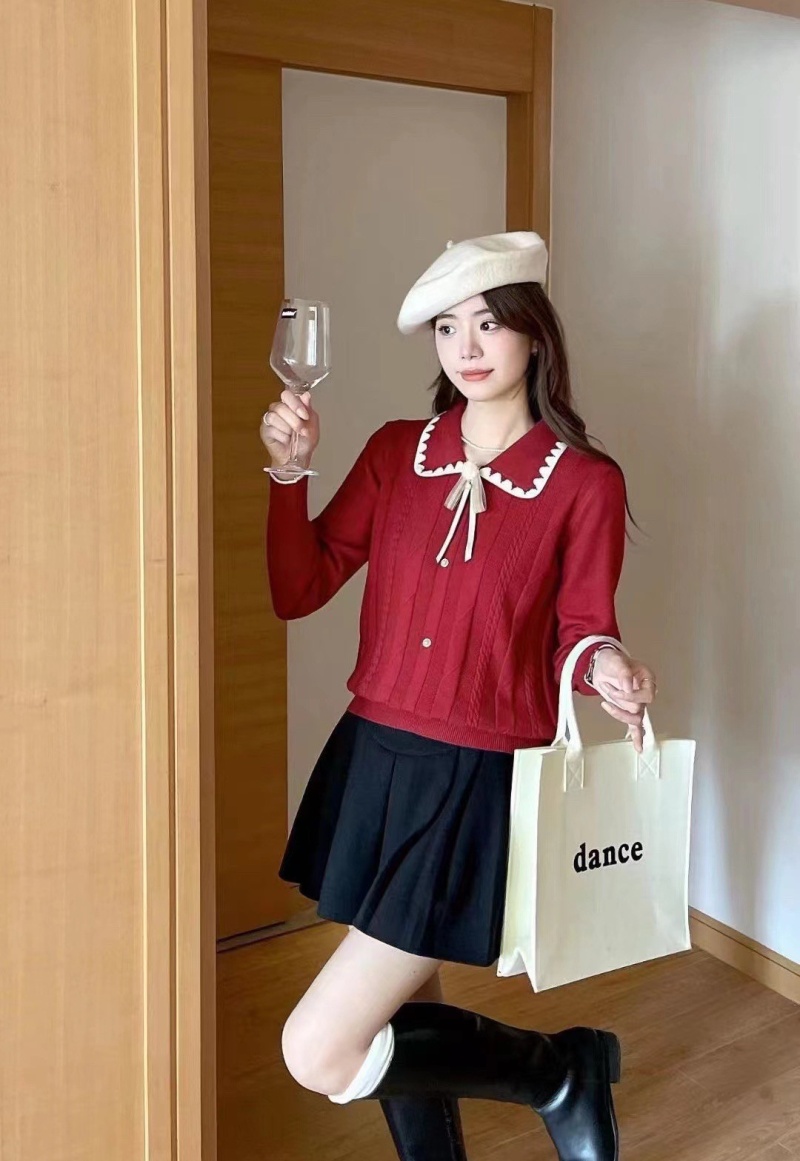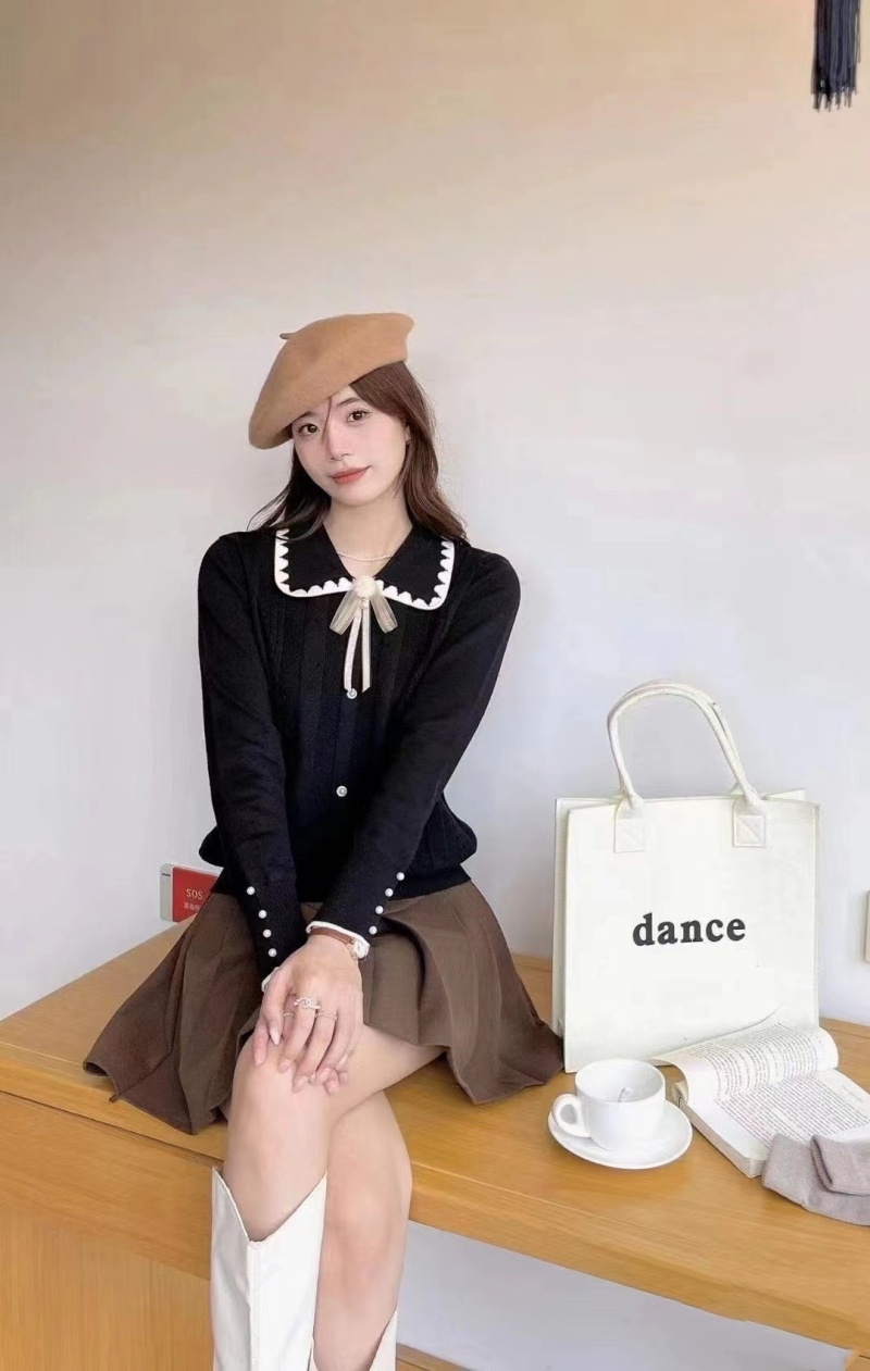韩版时尚小香风甜美娃娃领系带装饰排扣长袖2023秋冬新款上衣女