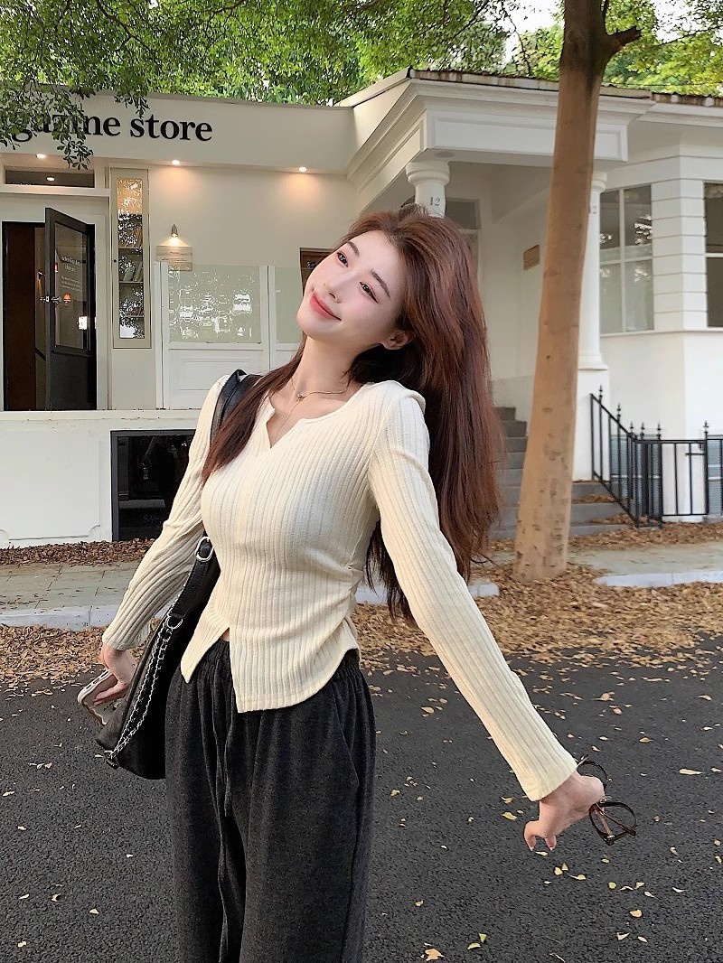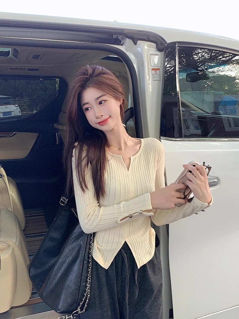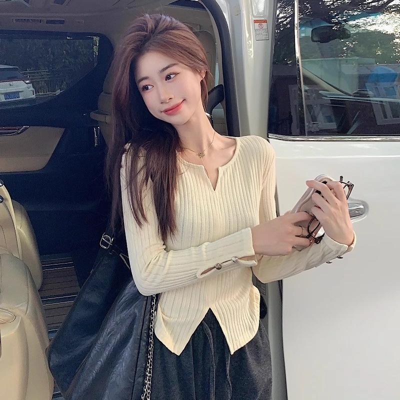 2023秋冬季新款性感风v领长袖针织衫女设计感显瘦打底休闲上衣女