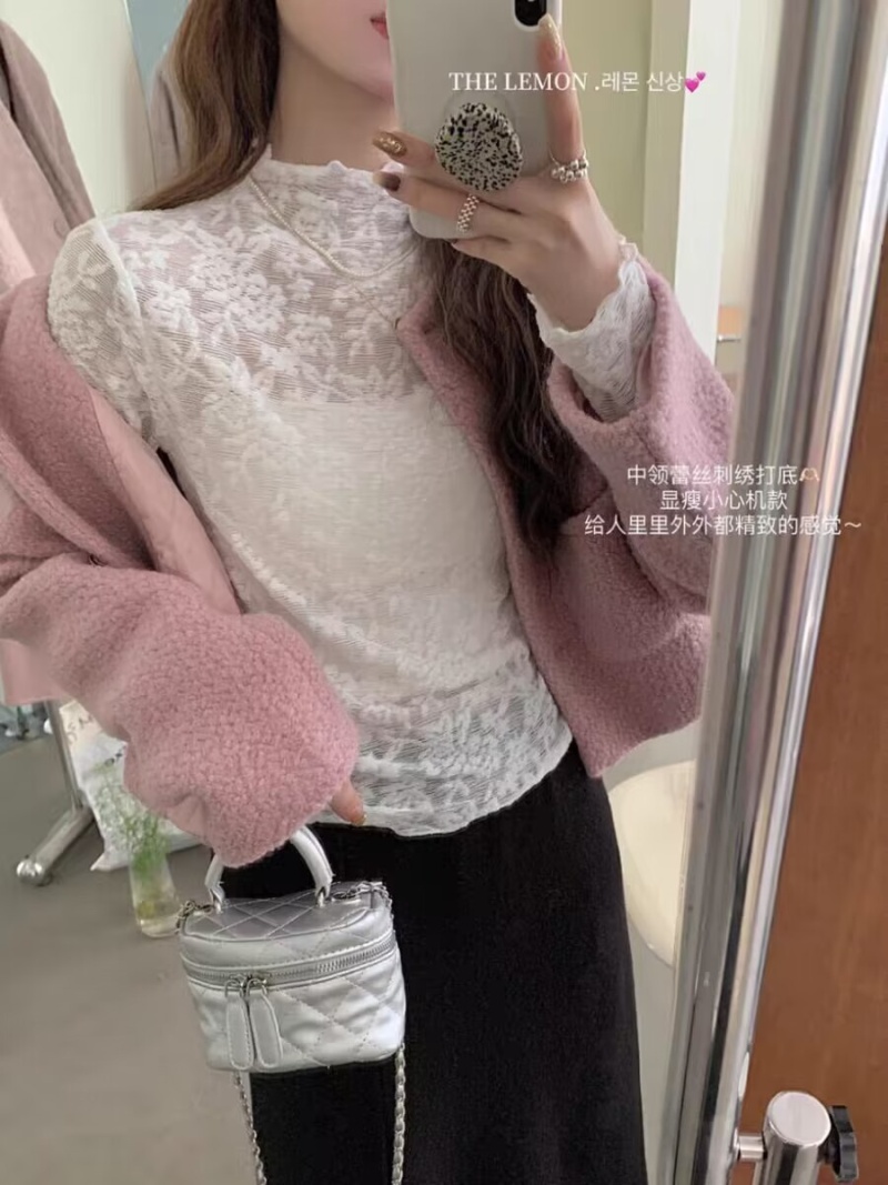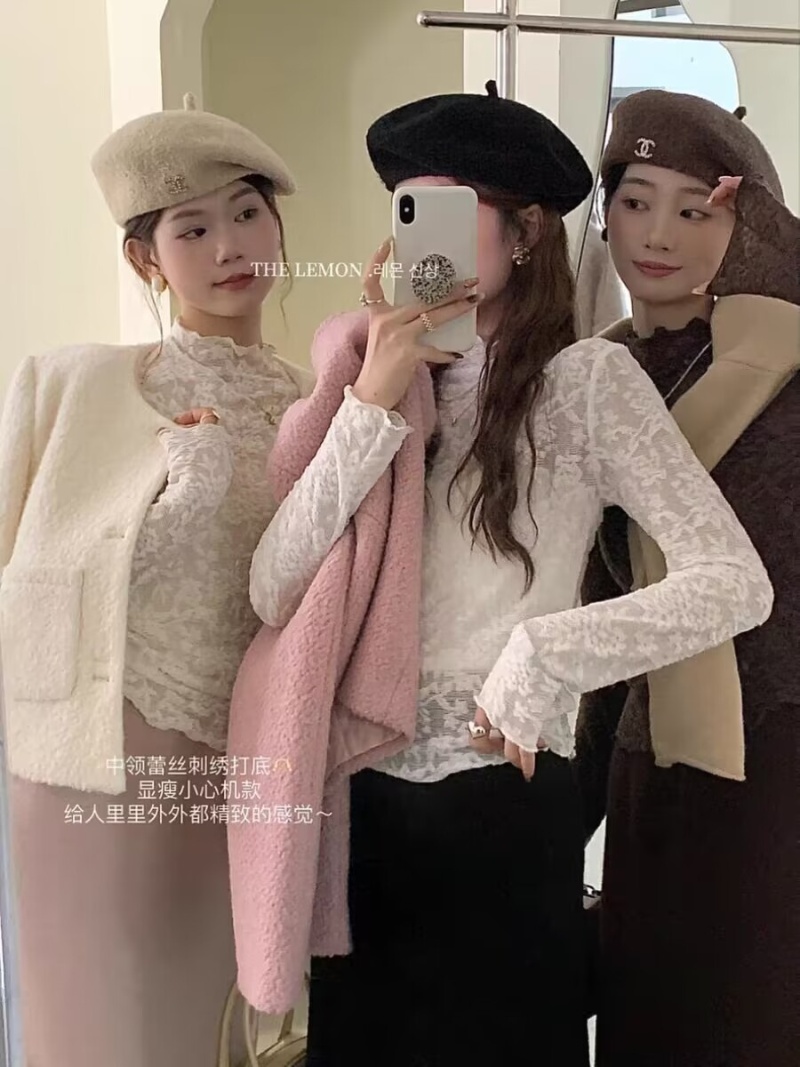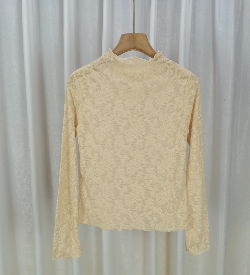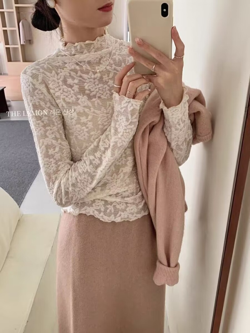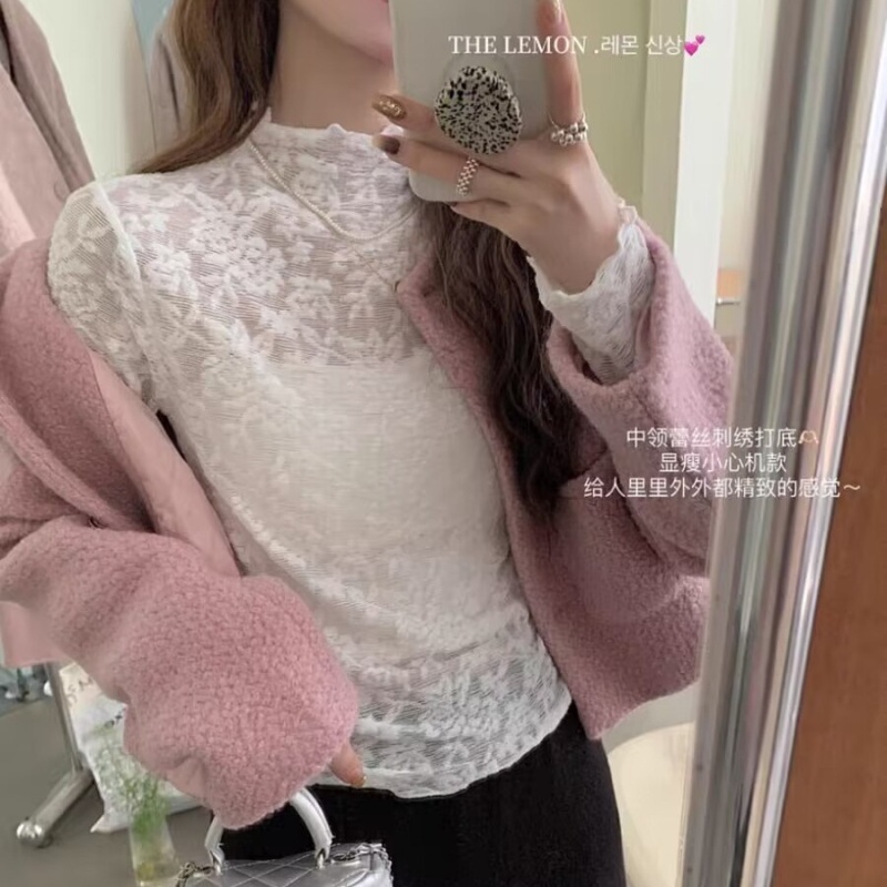 秋冬新款韩版温柔甜美风木耳边半高领内搭蕾丝花针织衫长袖上衣女