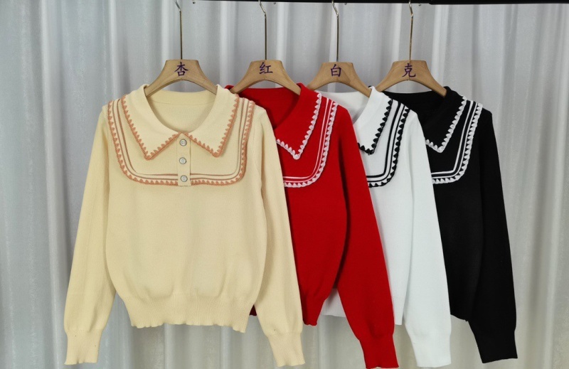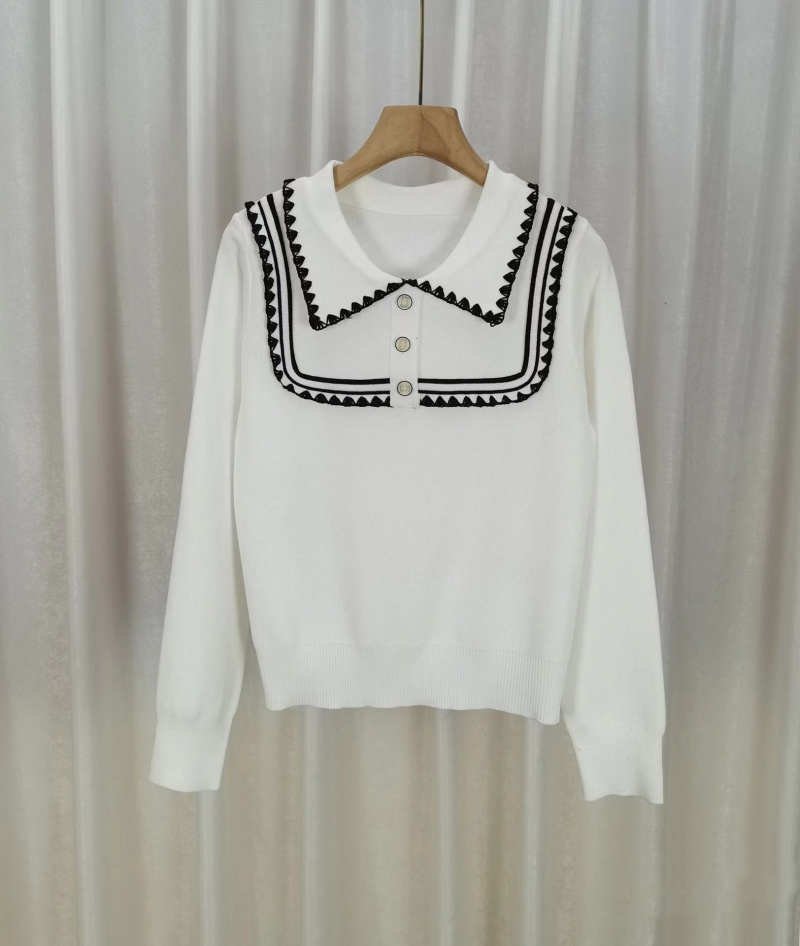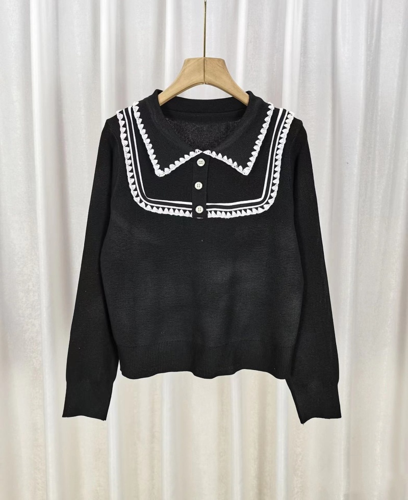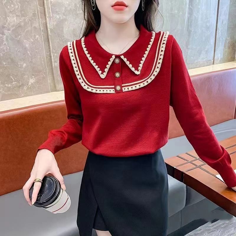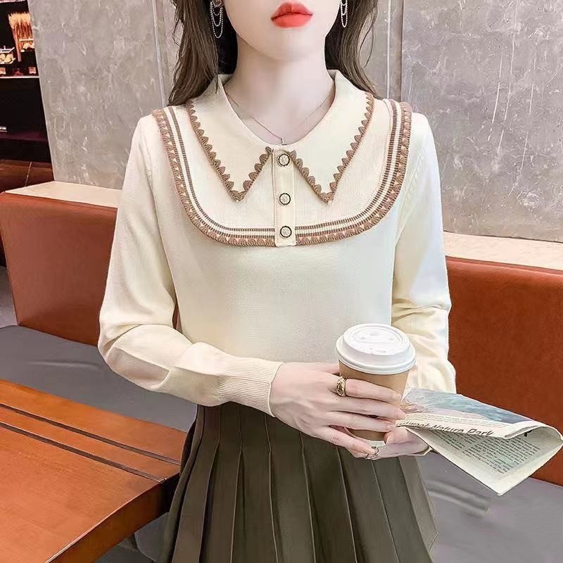 韩版洋气修身减龄娃娃领刺绣边百搭秋冬新款设计感长袖针织上衣女