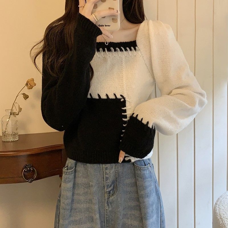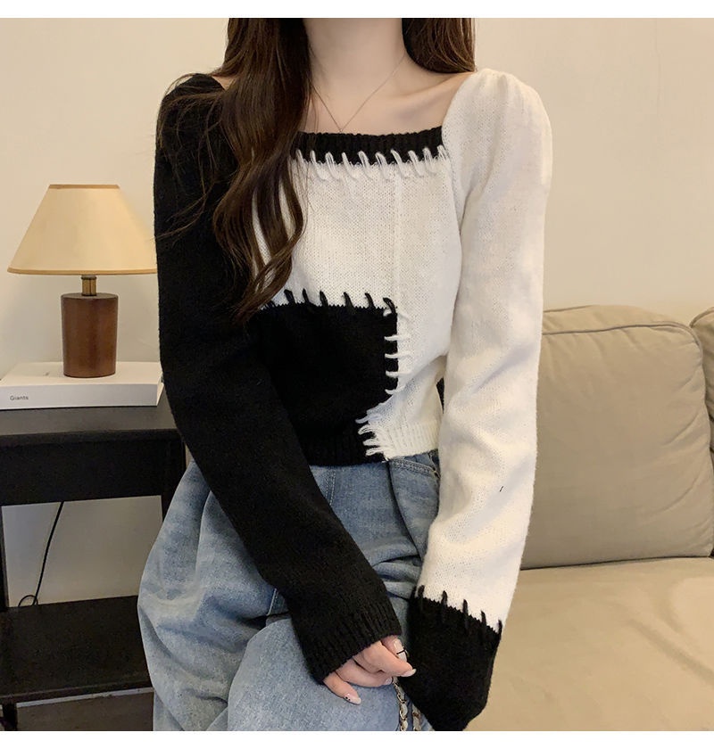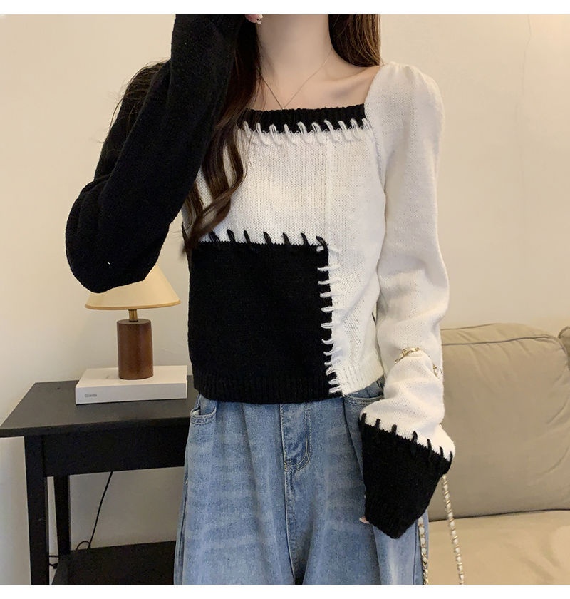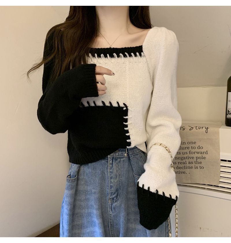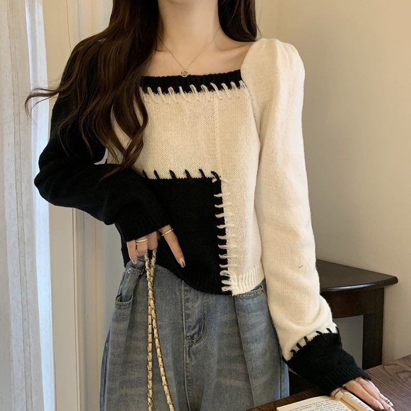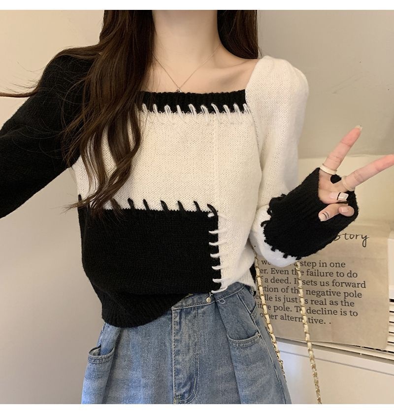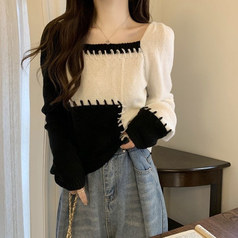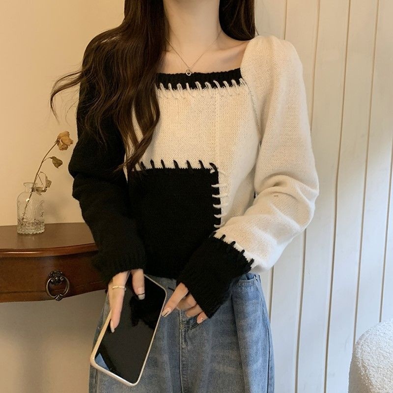2023春秋辣妹设计感修身显瘦内搭小个子打底上衣方领长袖针织衫女