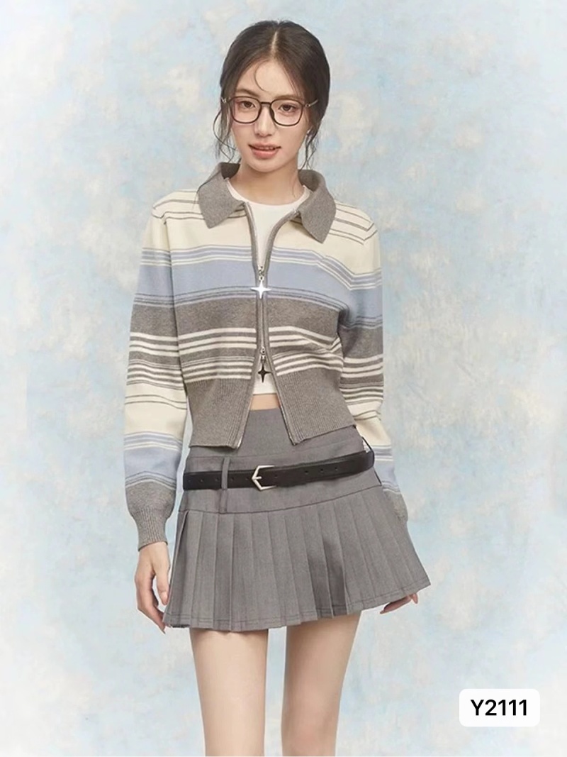 撞色条纹双拉链针织开衫女秋冬新款设计感小众翻领毛衣外套上衣潮