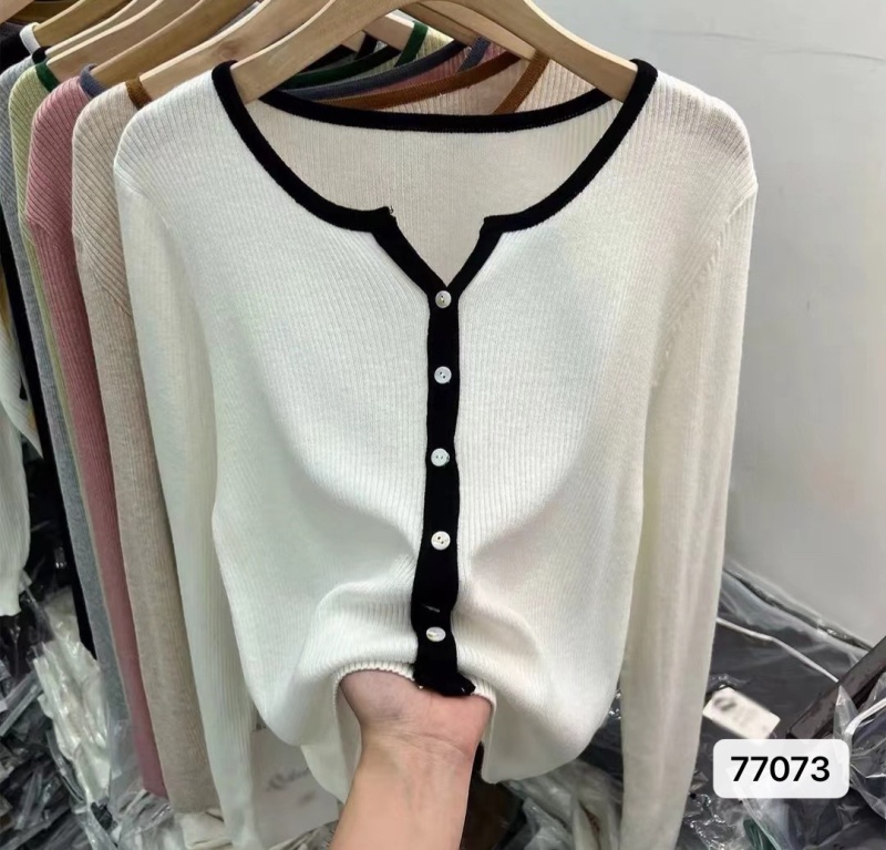 撞色剪刀领柔软坑条长袖针织衫开衫女上衣2023春新款修身薄款毛衣
