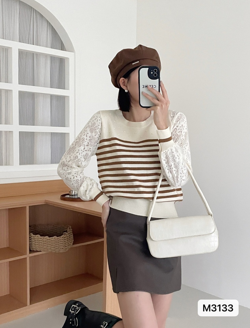 法式条纹假两件针织衫2023秋季女装新款拼接蕾丝袖洋气毛衣打底衫