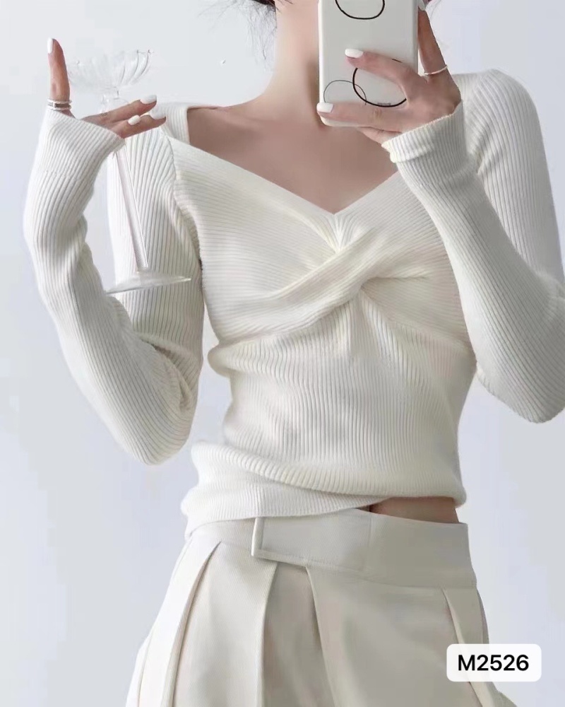 针织打底衫女 2023春秋新款洋气V领交叉长袖修身显瘦内搭紧身上衣