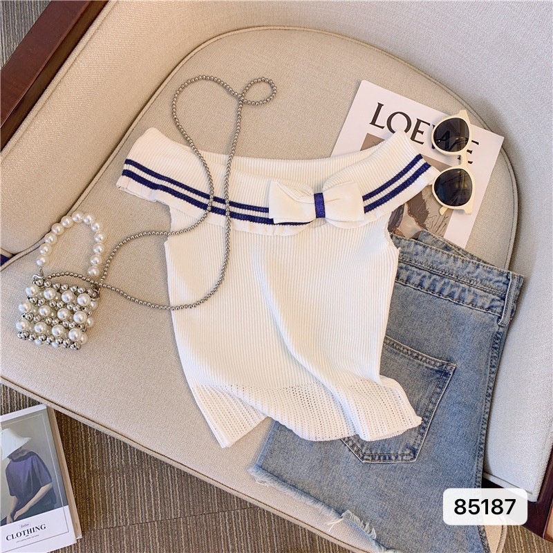纯欲针织衫夏季蝴蝶结一字肩薄款小香风气质修身显瘦短款上衣外穿