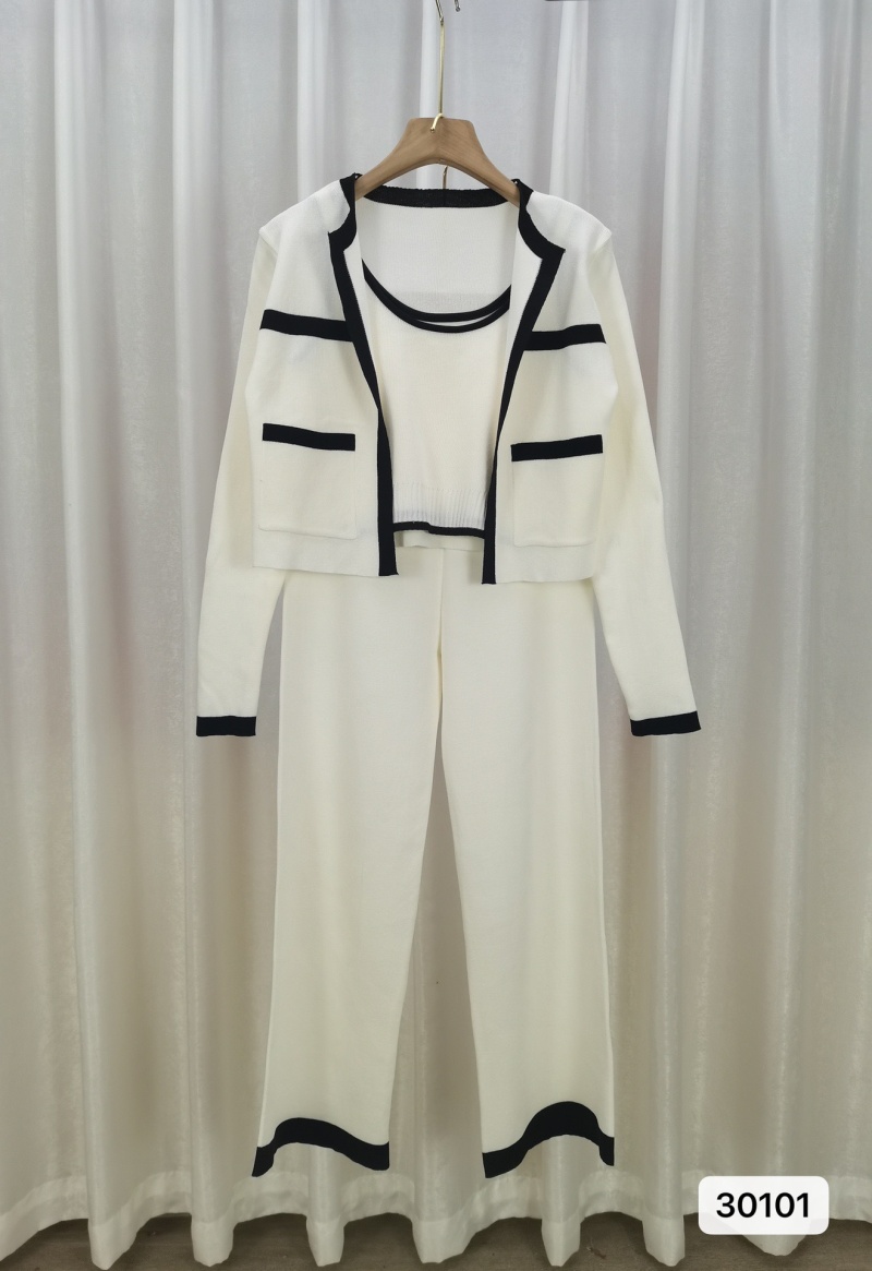 2023春秋季新款小香风甜美清新 圆领背心+长袖开衫+阔腿裤3件套装