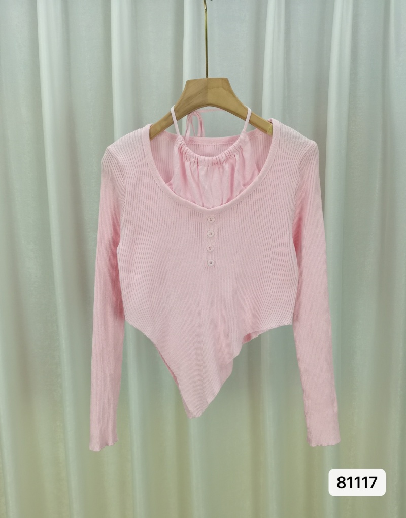 2023春季新款气质纯欲挂脖上衣女修身显瘦不规则长袖短款针织衫潮